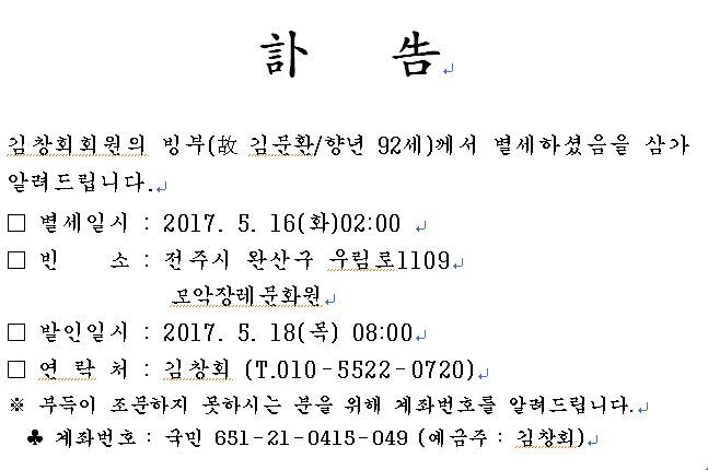 [부고]김창회 회원 빙부상 알림 작성자친구네(나성동)|작성시간17.05.16|조회수76 목록 댓글 0 글자크기 작게가 글자크기 크게가 다음검색 현재 게시글 추가 기능 열기 북마크 공유하기 신고 센터로 신고 댓글 댓글 0 댓글쓰기 답글쓰기 댓글 리스트