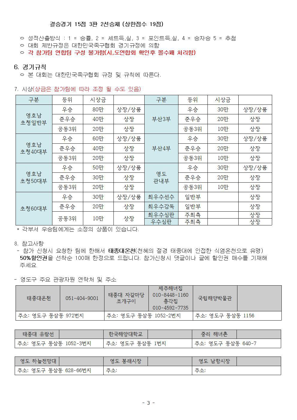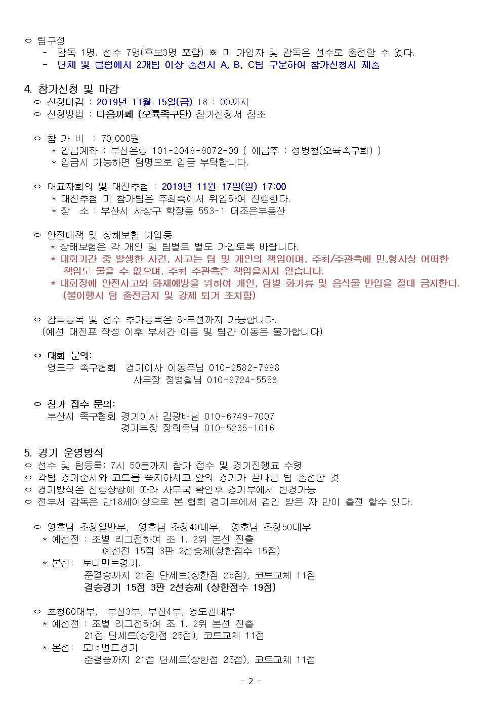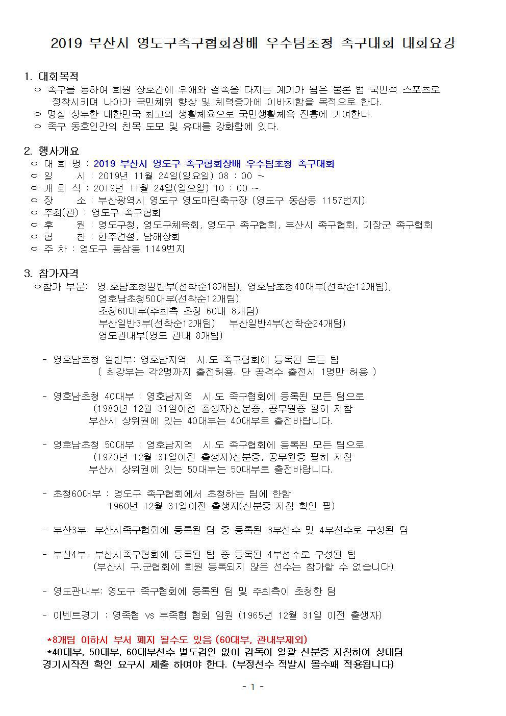 2019 부산시 영도구 족구협회장배 우수팀 초청 족구대회 대회요강 (11/24) 작성자부산오륙(정명재)|작성시간19.10.21|조회수75 목록 댓글 0 글자크기 작게가 글자크기 크게가 다음검색 현재 게시글 추가 기능 열기 북마크 공유하기 신고 센터로 신고 댓글 댓글 0 댓글쓰기 답글쓰기 댓글 리스트