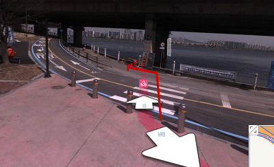 쭈욱 내려오면 아래 사진처럼 자전거 도로와 건널목이 보입니다.