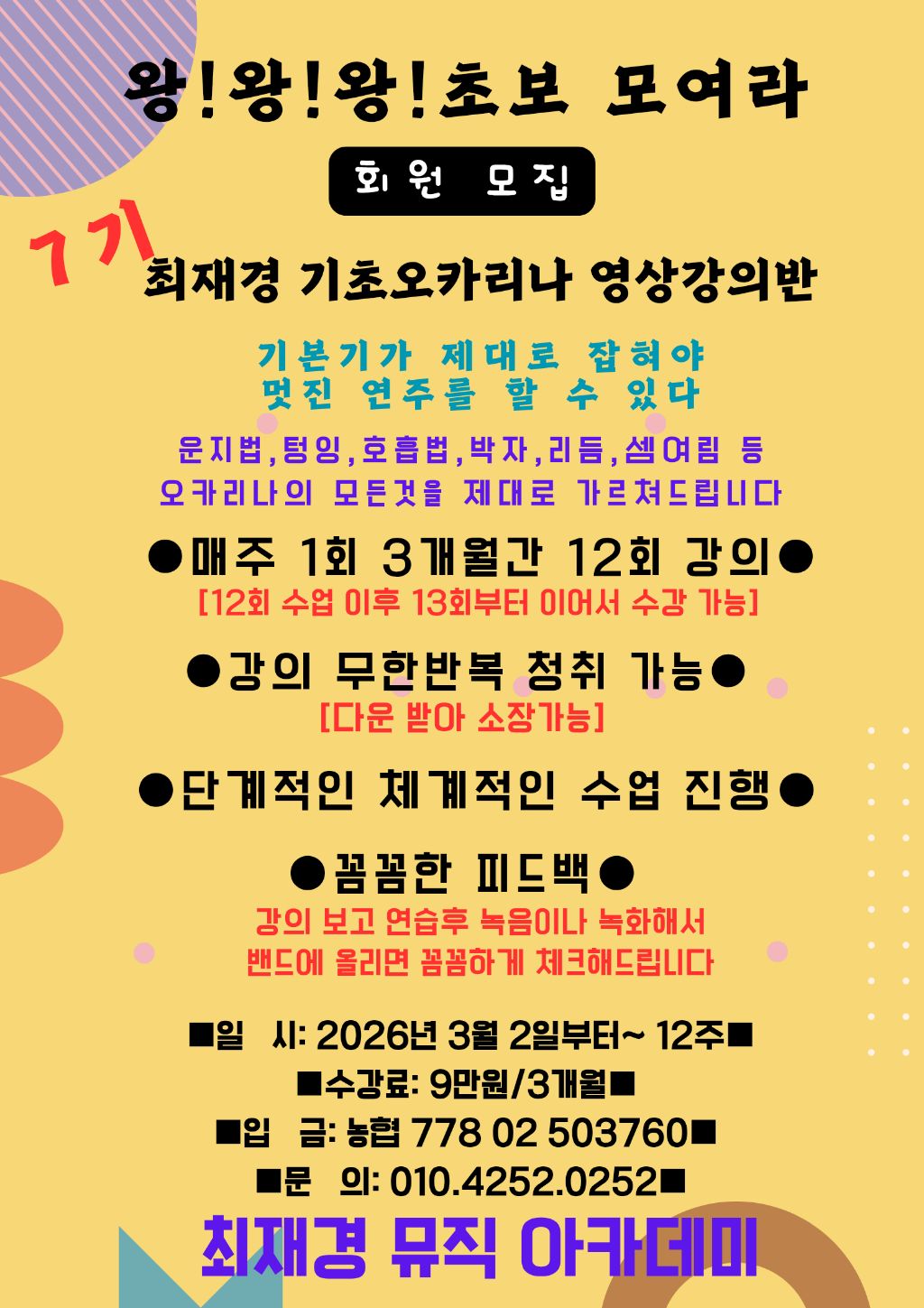 7기.최재경 왕초보오카리나 영상강의 회원 모집