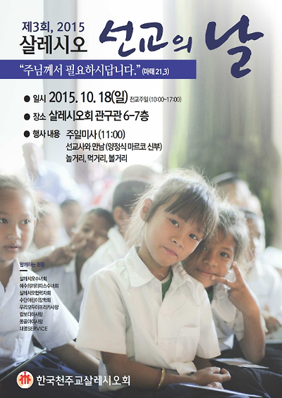 일시: 10월 18일(일) 10:00~17:00 장소: 살레시오회 관구관 6~7층 내용: 주일미사(11:00) 선교사와의 만남, 놀거리, 먹거리, 볼거리 오시는 길: 7호선 보라매역 3번 출구에서 도보로 7분 *무료주차 가능(내비게이션 창에 ‘돈보스코 센터’)