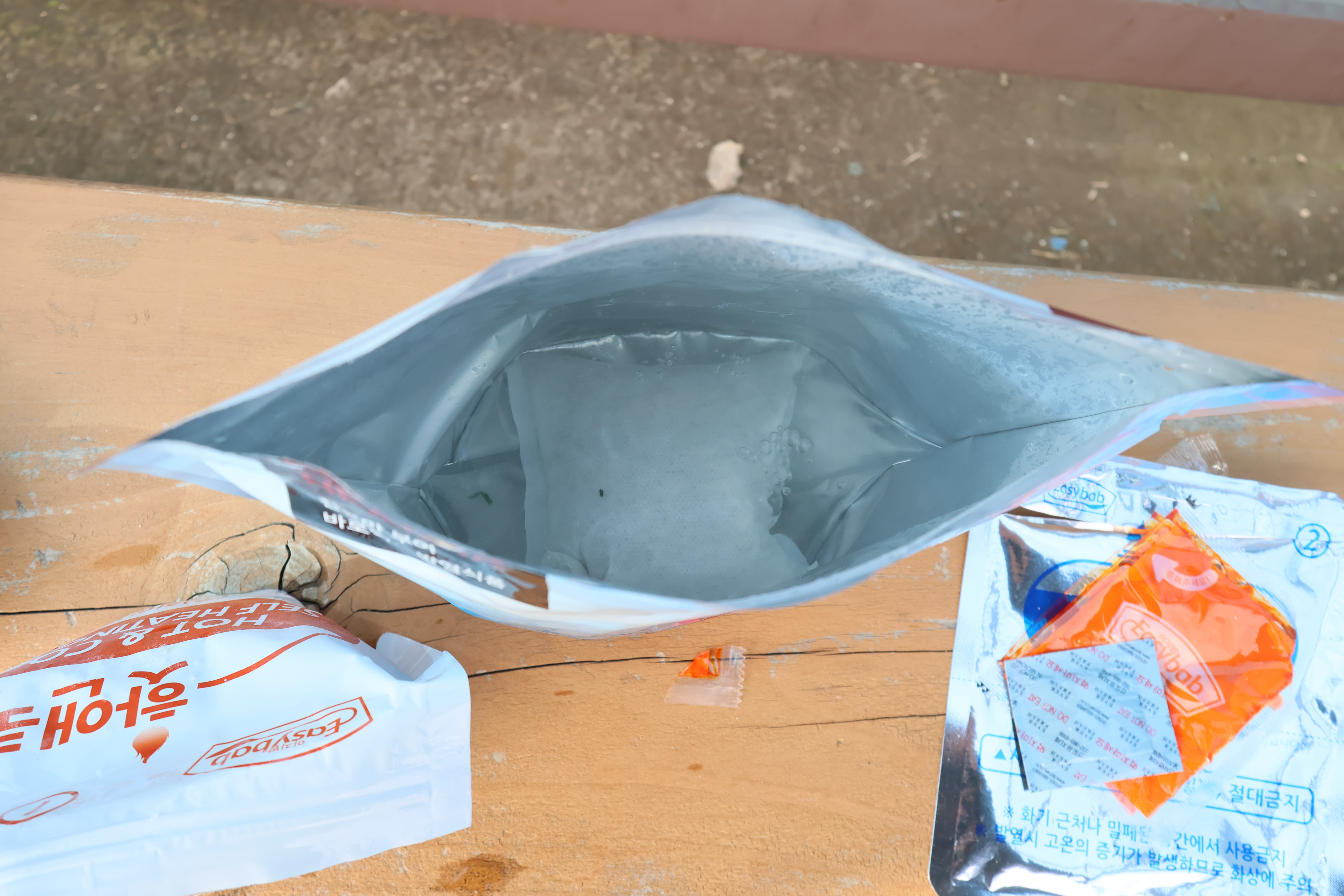 겉봉, 은박지같은것 속에 들어 있는 발열재 1번이라 쓰여있는 내용물(도시락)