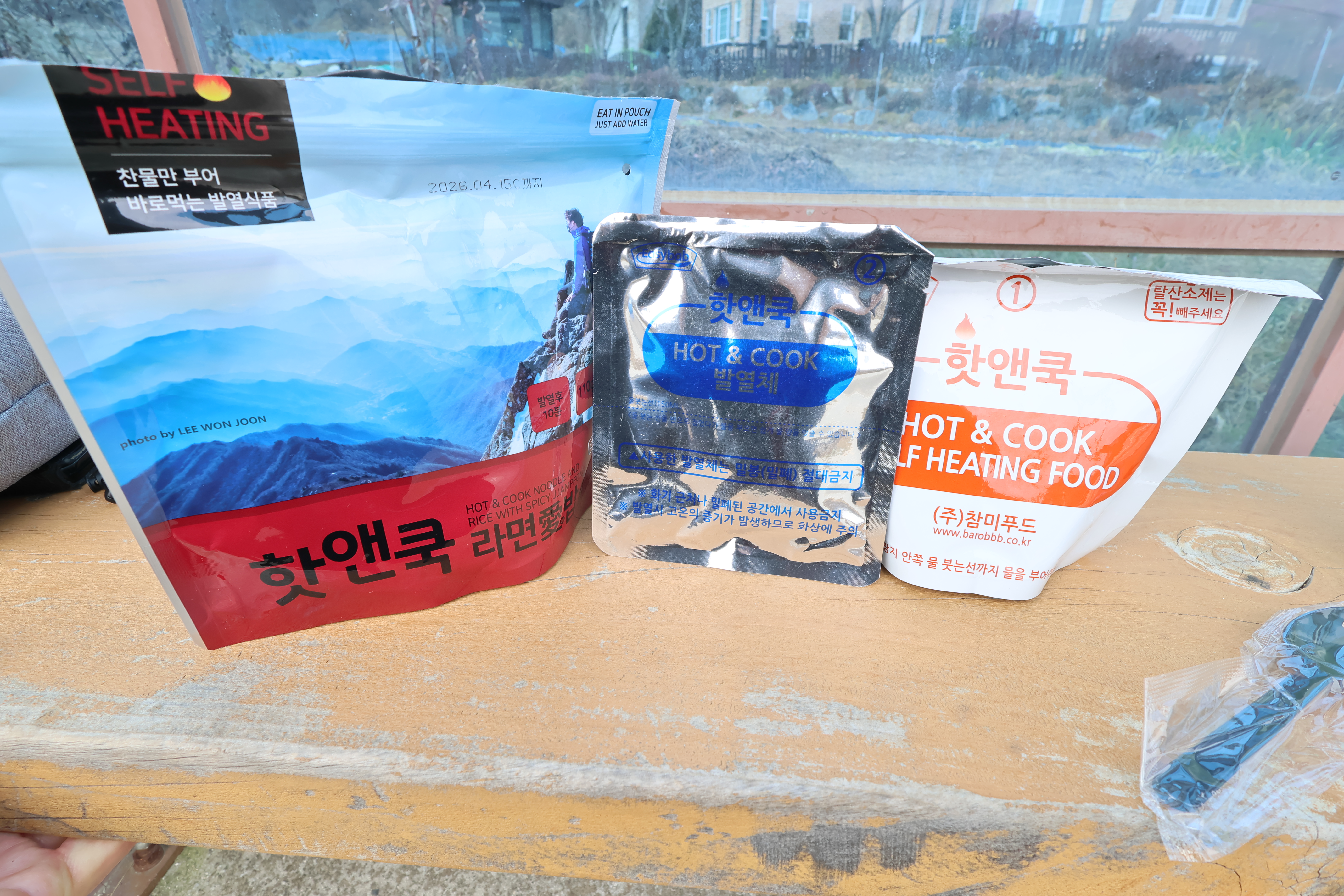 가운데 핫팩 같이 생긴것이 발연재이다. 오른쪽이 라멘과 건조밥이 들어있는것이고 ..