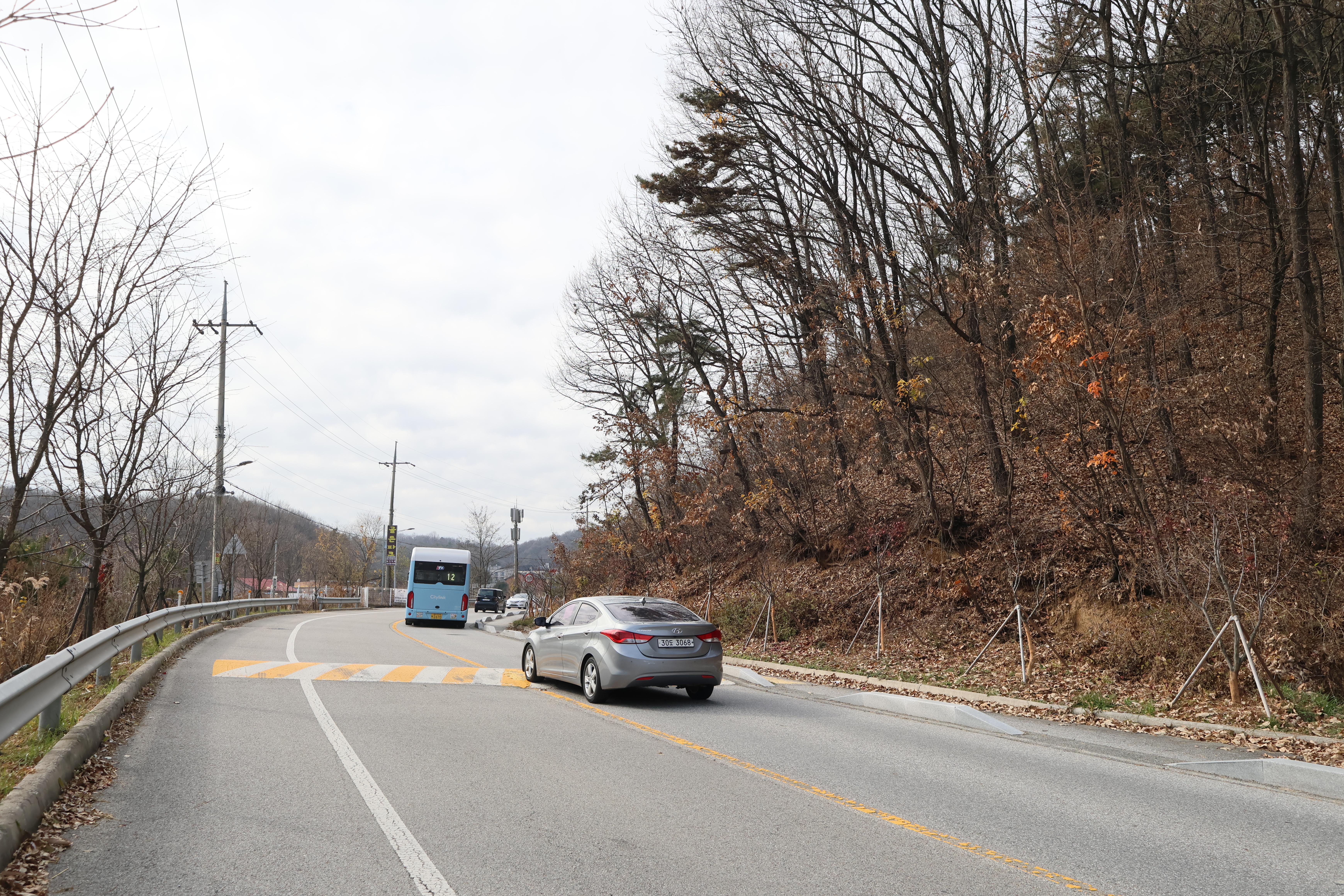 건너서 걸어면 인도가 없고 차들이 쌩쌩 달리는 길이라 위험하니 건너지 말고 우측방향으로 그냥 걸어가는것이 좋다.