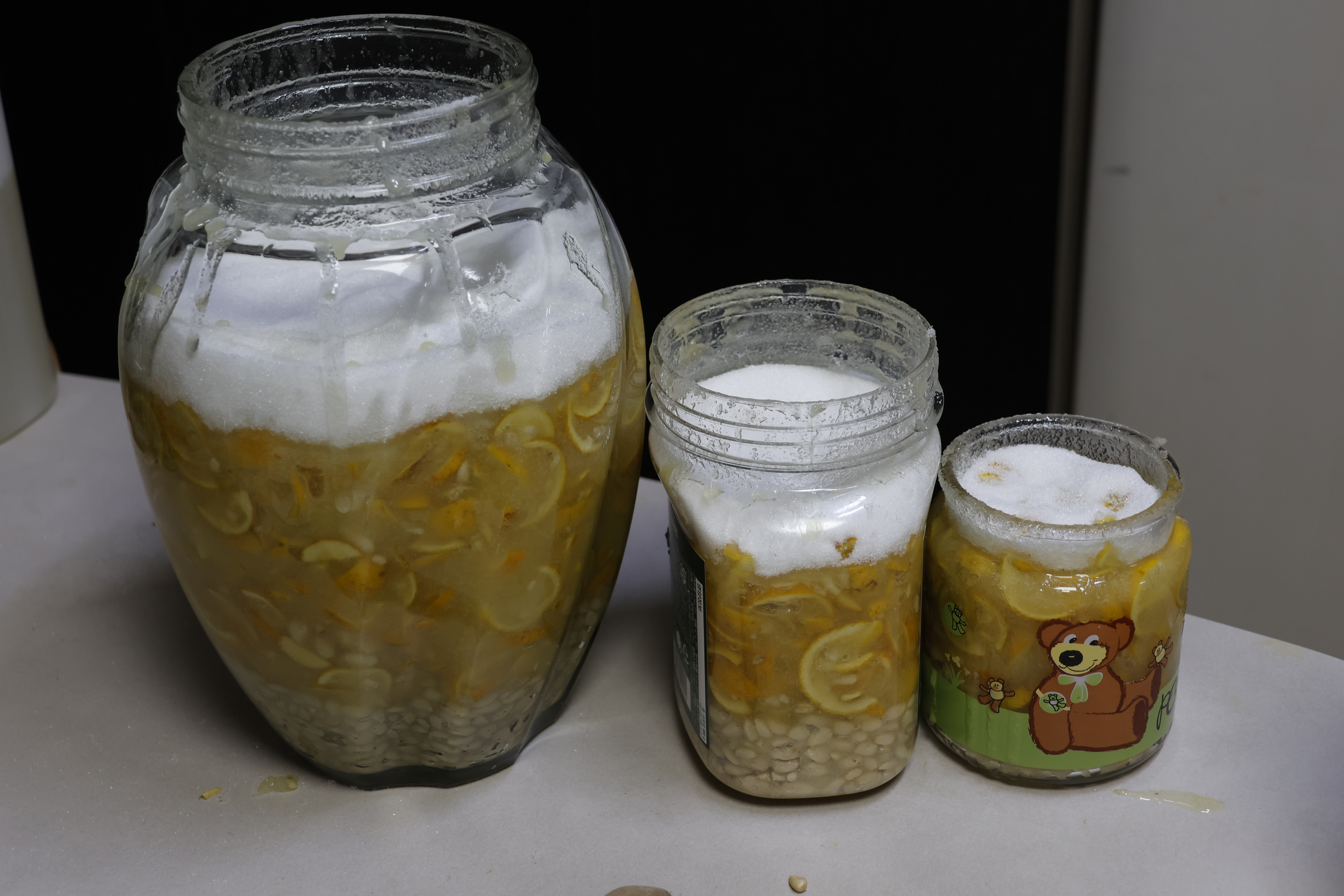 병에 담은후 위에 설탕을 부어 공기차단과 곰팡이 발생을 예방한다.