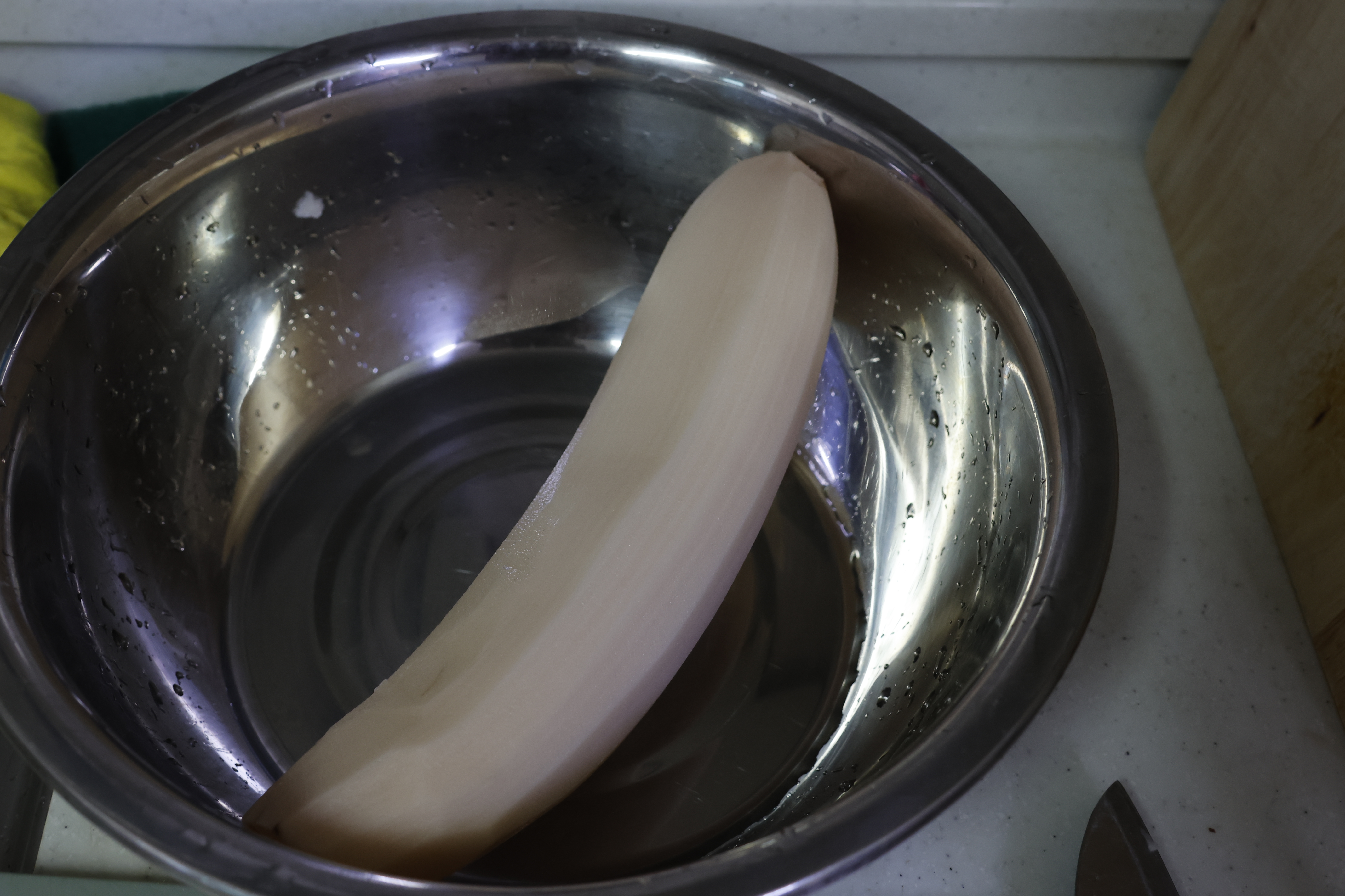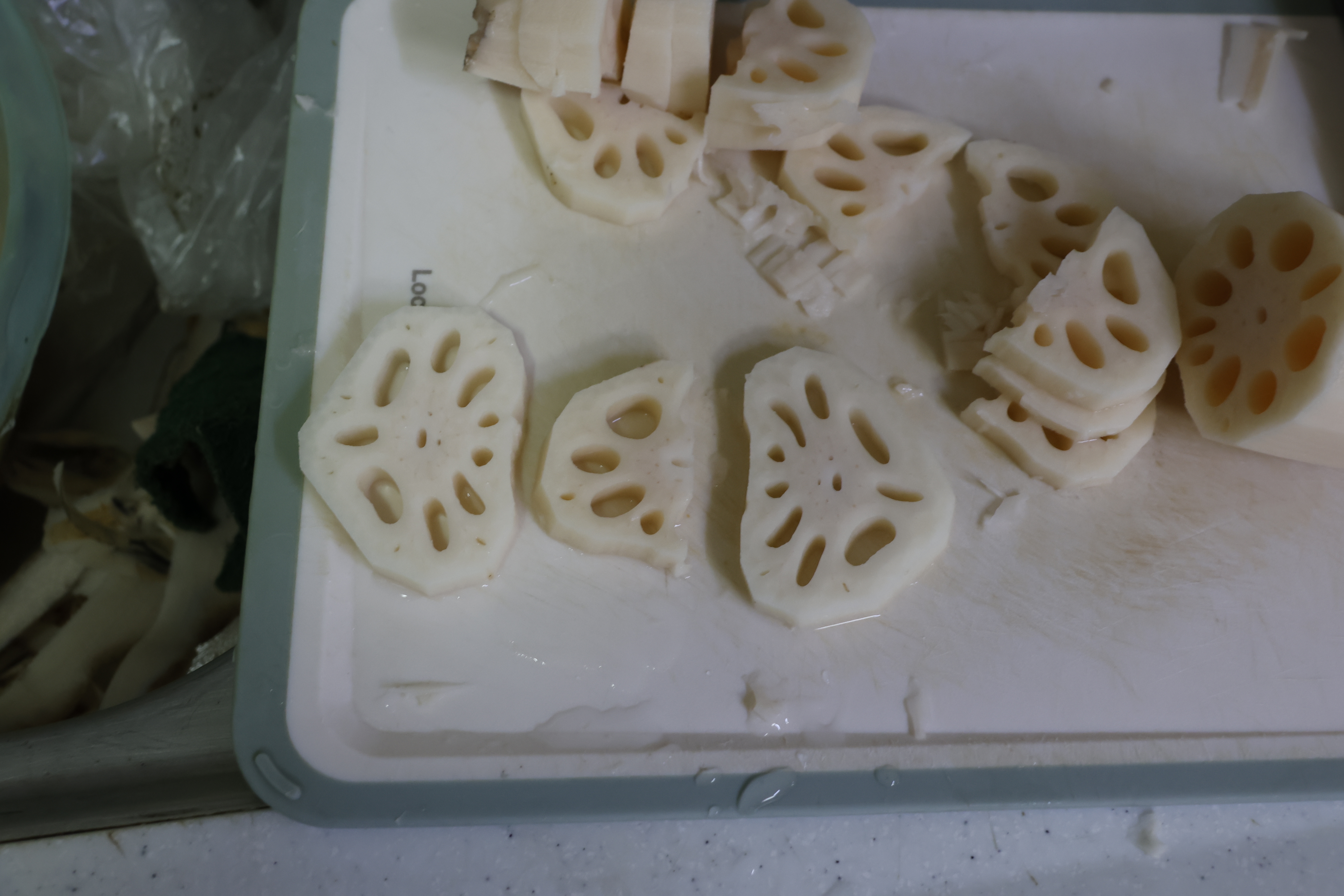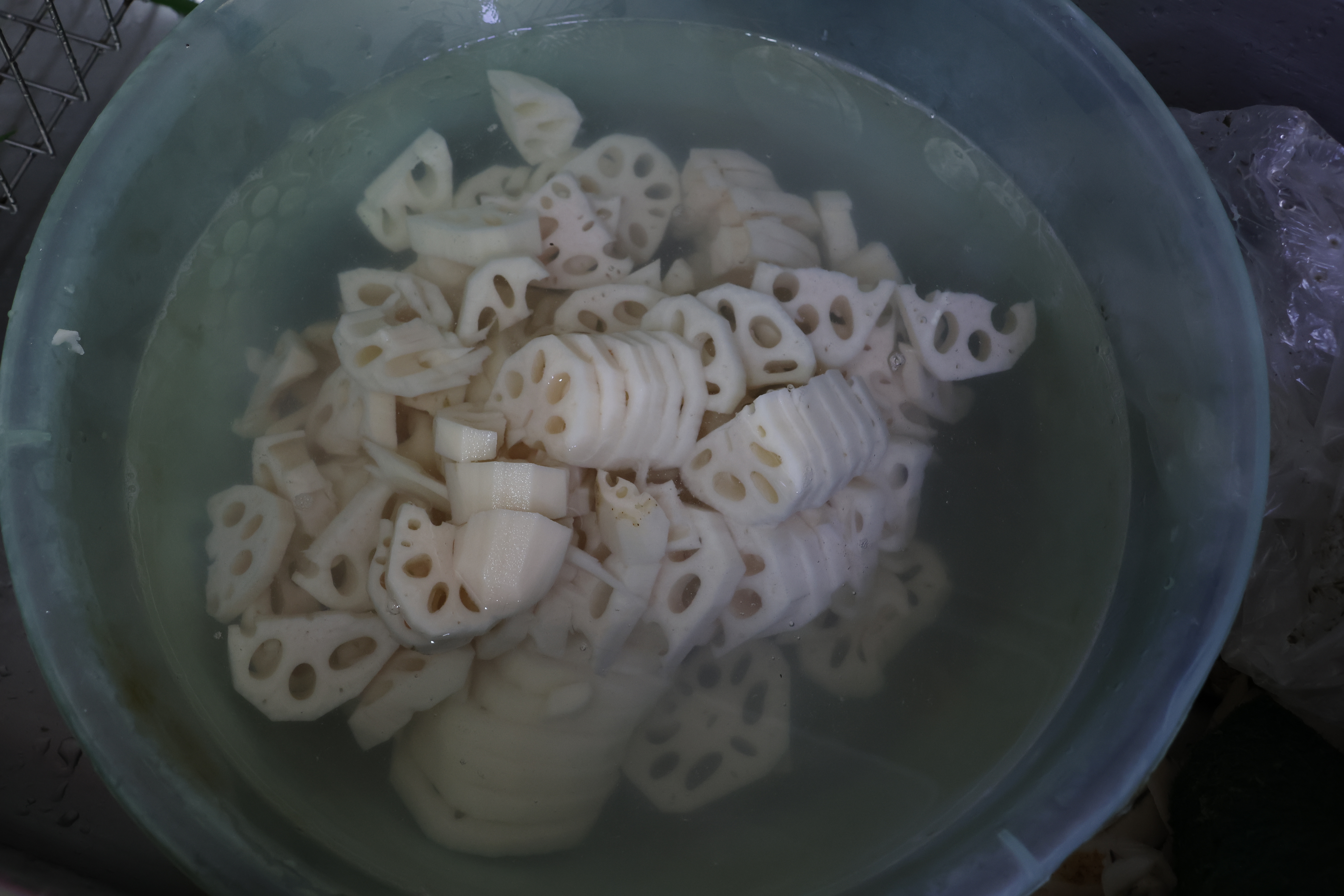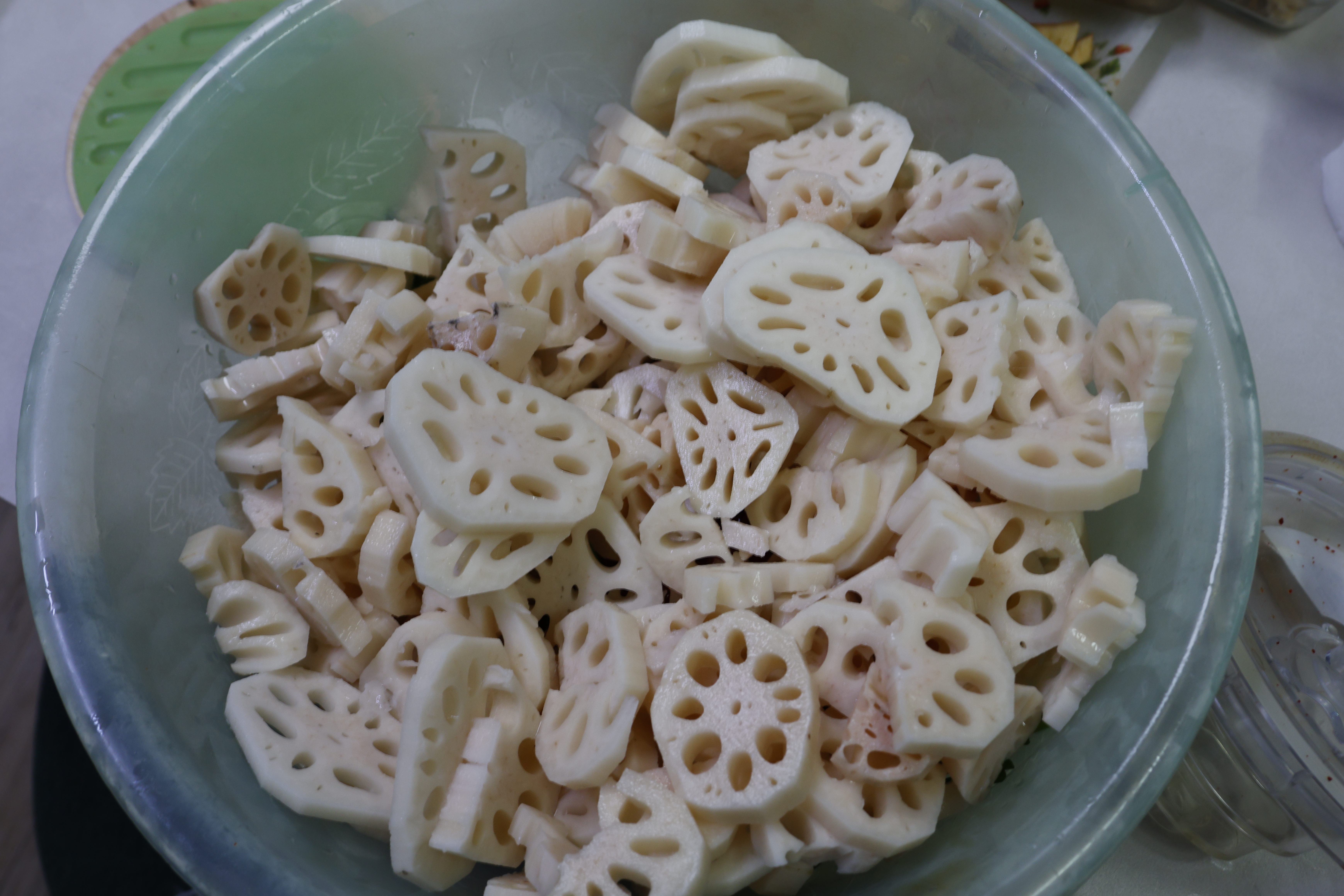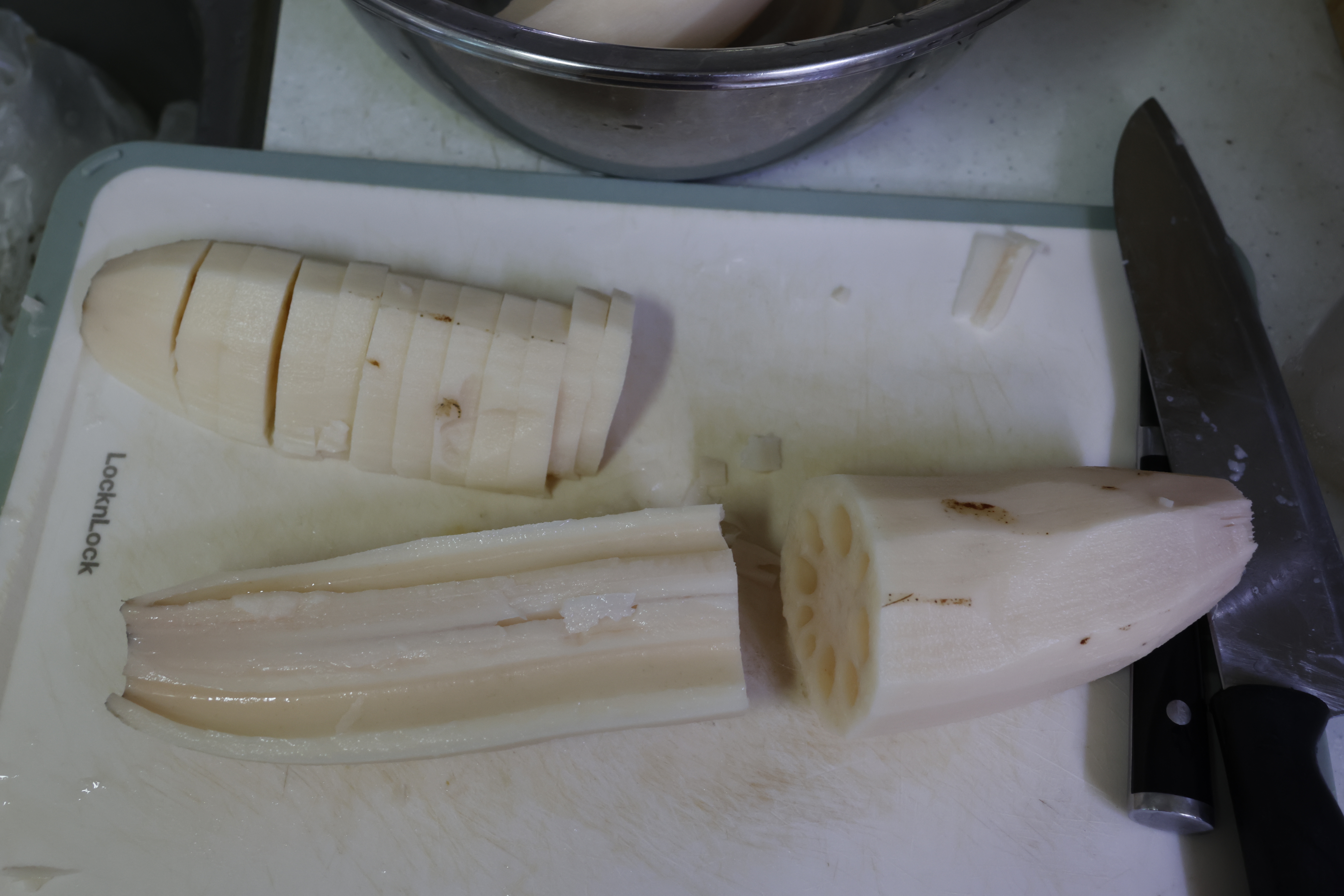 굷은 연근은 반으로 쪼개어 저런식으로 반달모양으로 썬다