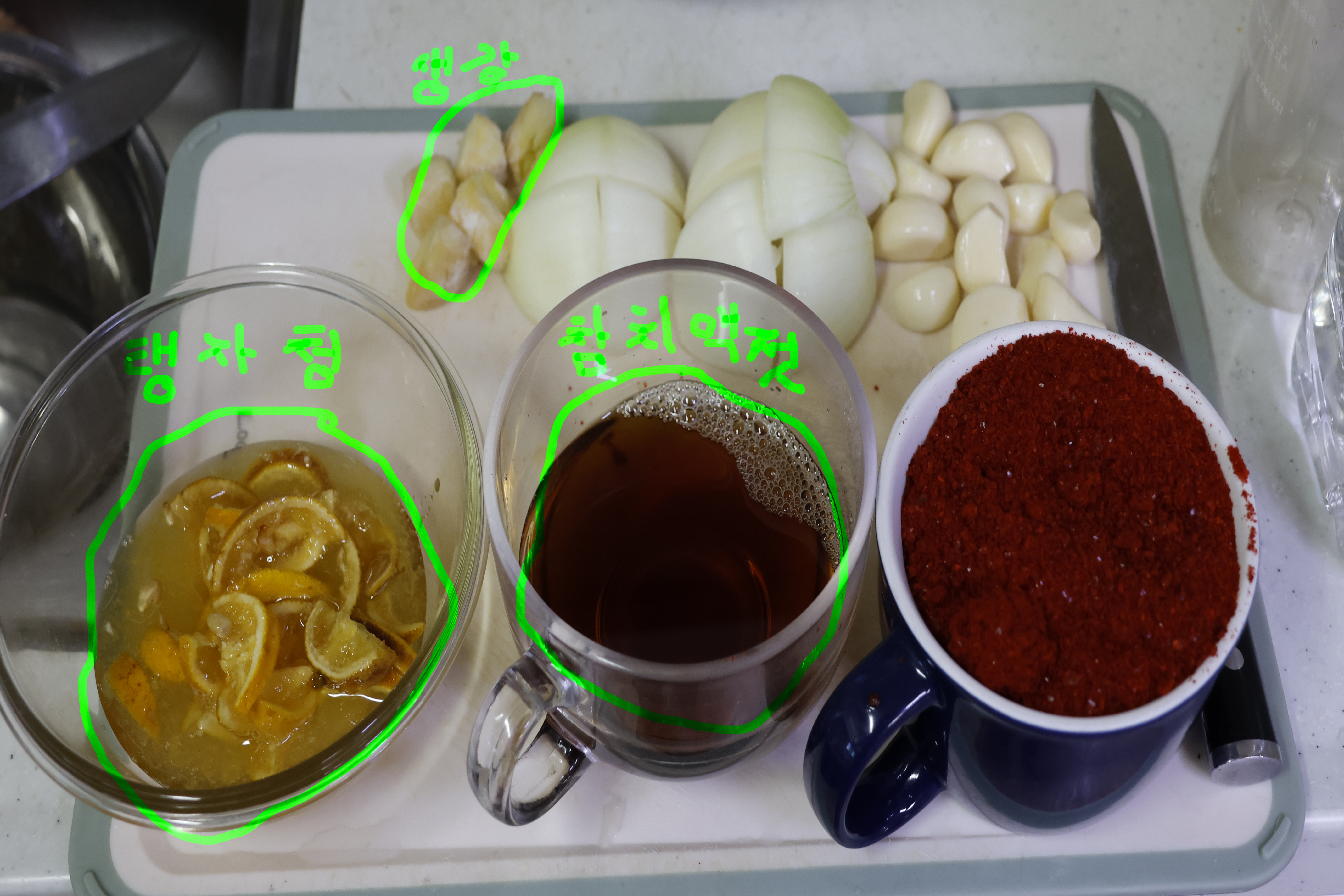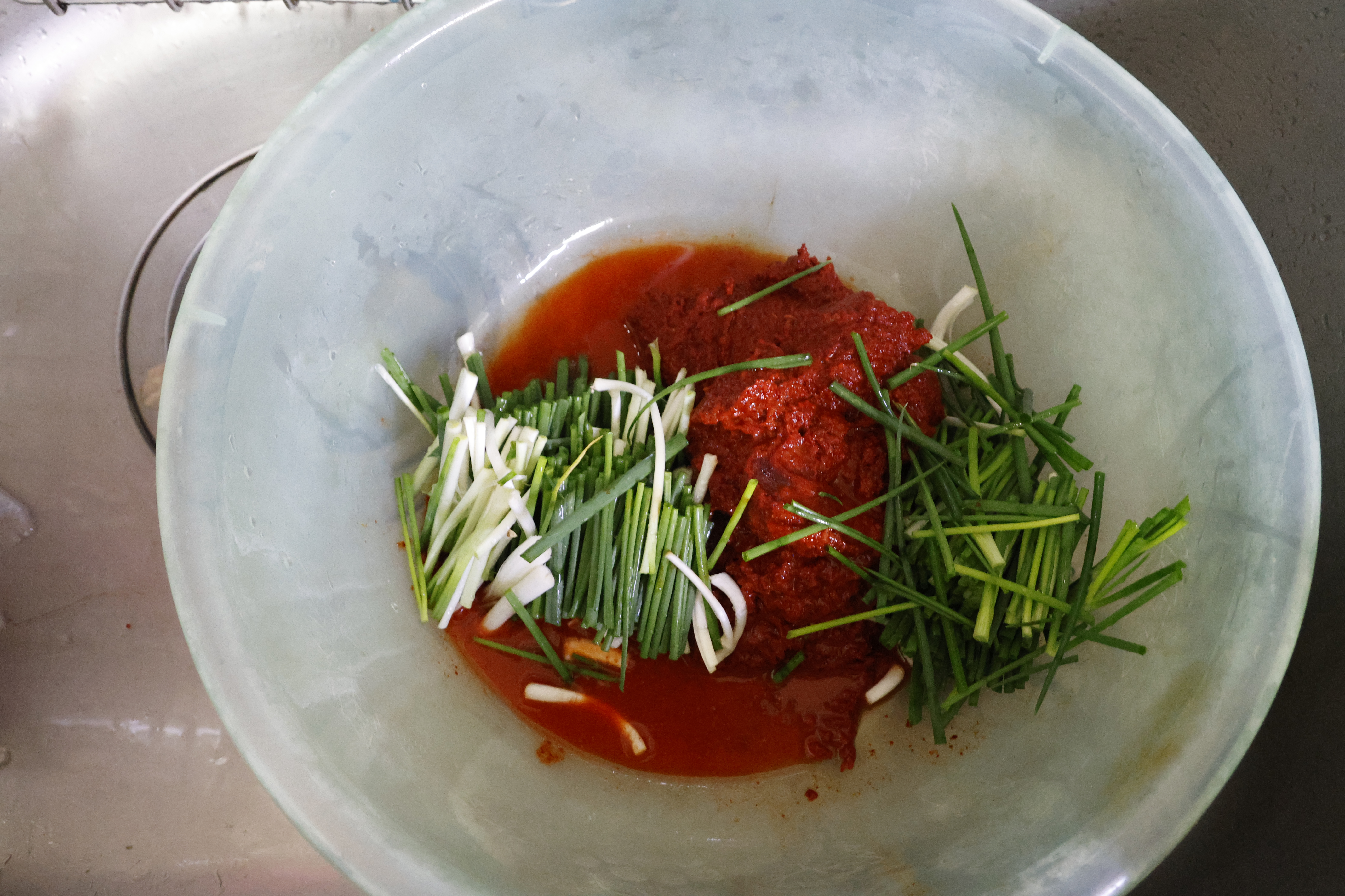 사진에는 없지만 조선파(쪽파)를 한줌 씻어 5cm간격으로 썰어둔다.