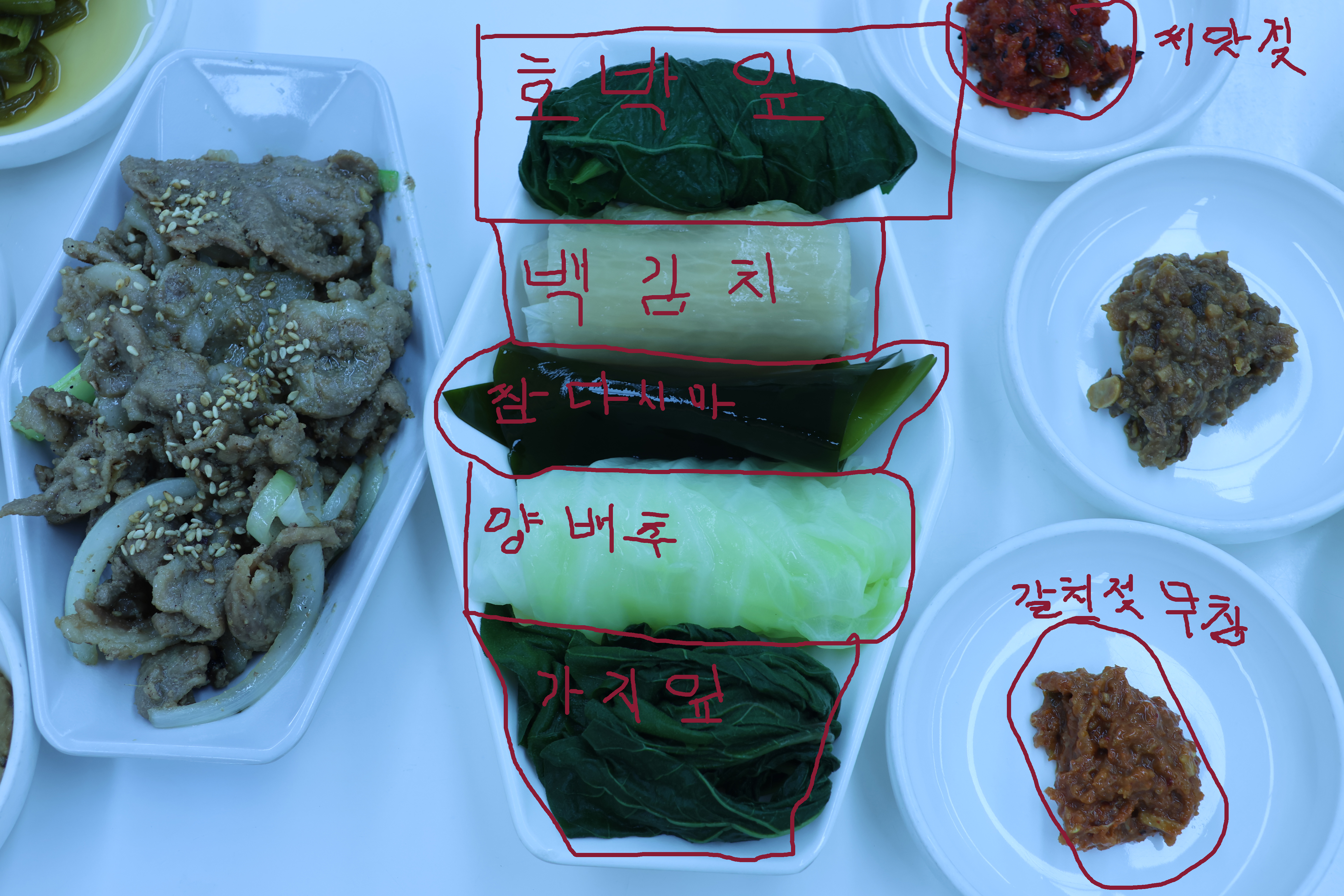 가지잎에 고기 갈치젖(???약간 비린내가 나는것보면 갈치속젖일듯....) 화면에는 않보이지만 뽁은김치 넣고 한쌈하면 캬~~~~