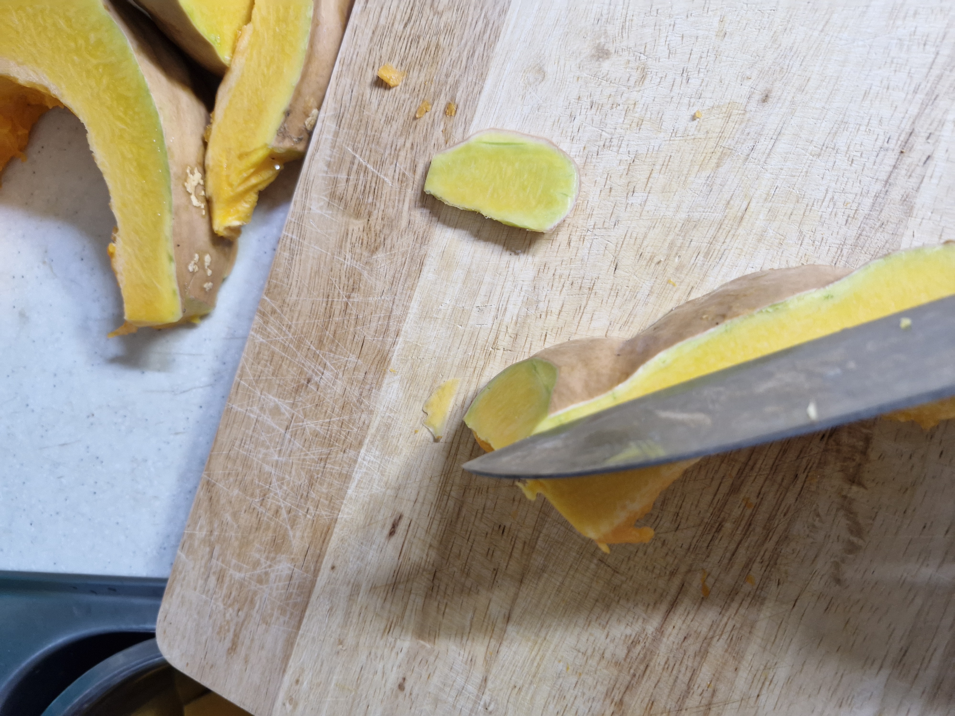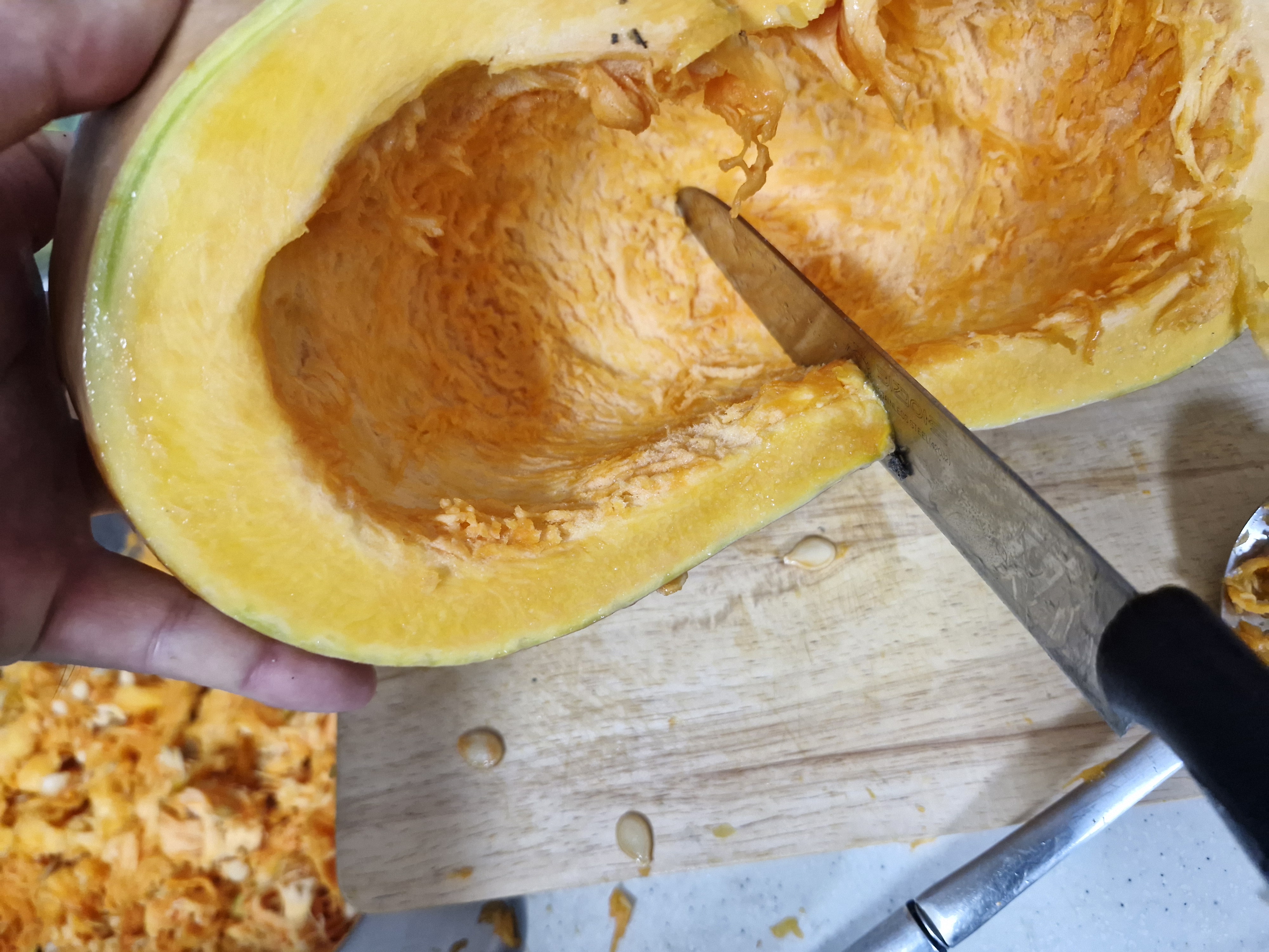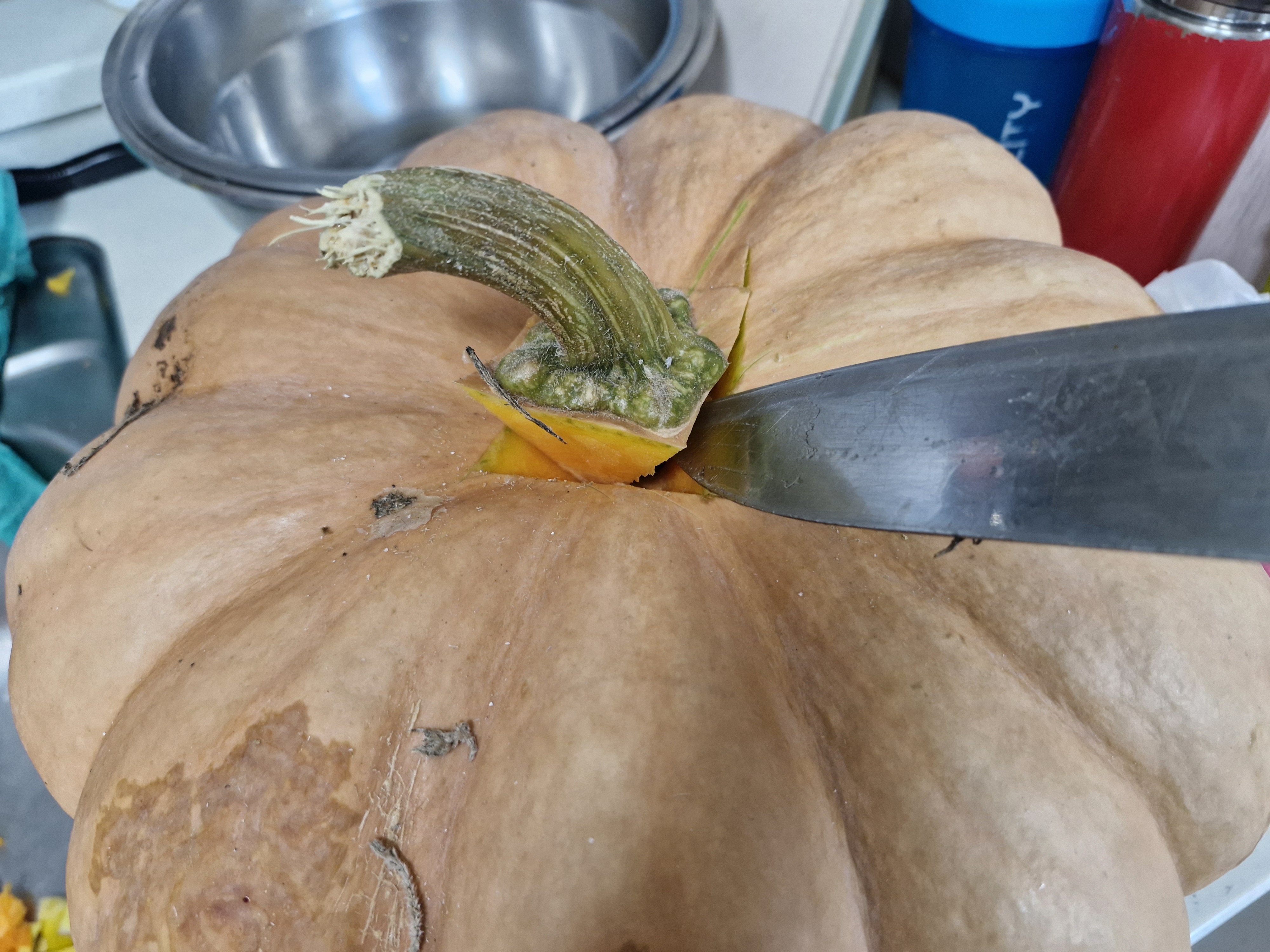 호박은 겉껍질이 단단하여 칼쓸때 조심해야 한다, 팁은 꼭찌???(표현이 좀 거시기허냉)때어낸 안쪽에 칼을 넣고