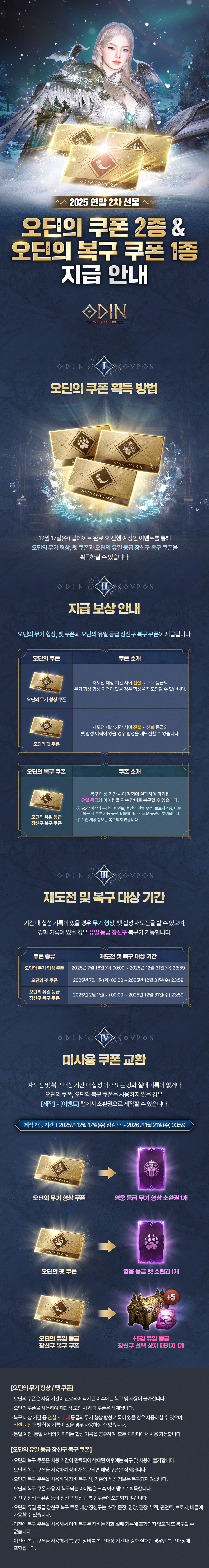 【 2025 연말 2차 선물 오딘의 쿠폰 2종 & 오딘의 복구 쿠폰 1종 지급 안내 】