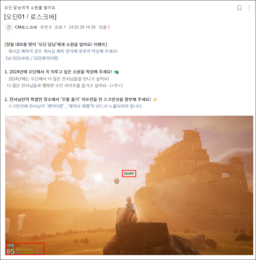 ① 게시글 작성 시 꼭 [오딘 달님에게 소원을 빌어요]에 '오딘에서 꼭 이루고 싶은 소원', '캐릭터명', '캐릭터의 레벨'이