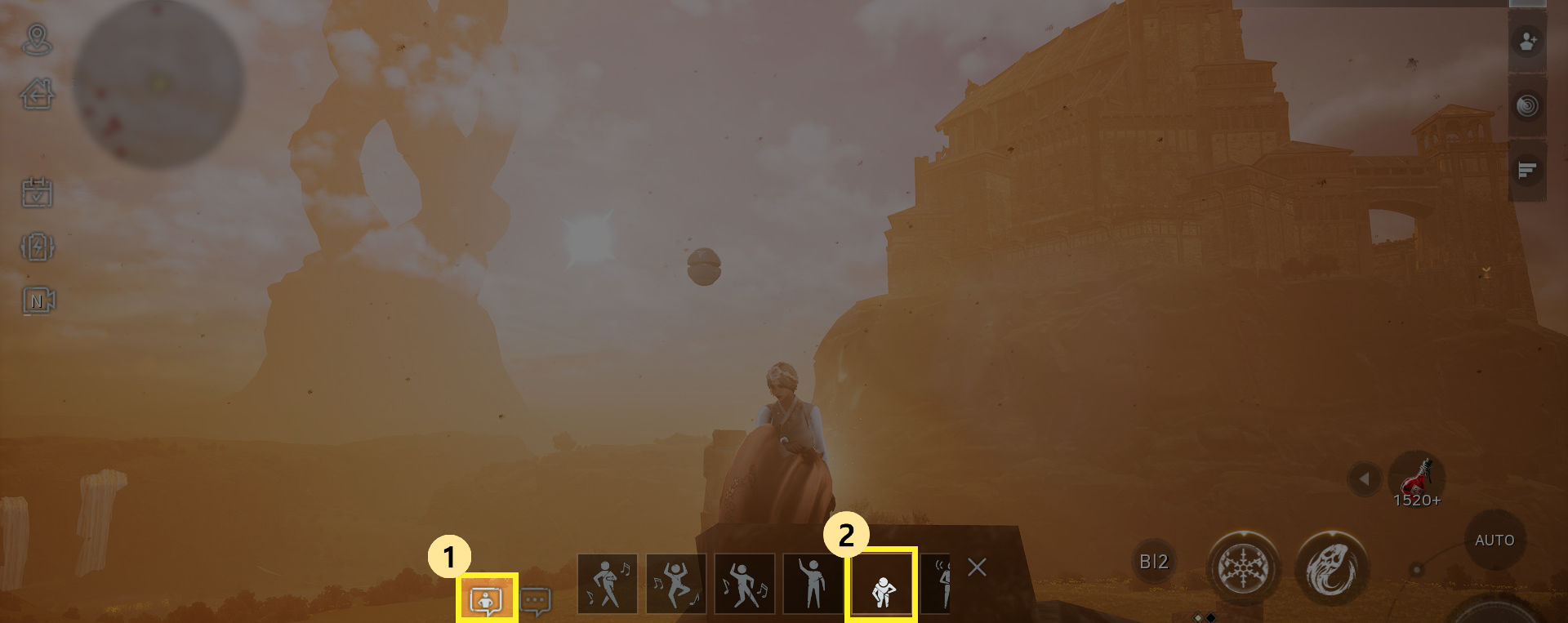 - 중앙 하단의 이모션 아이콘 클릭 후 '무릎 꿇기' 아이콘 클릭 시 캐릭터가 무릎을 꿇는 이모션을 취하게 됩니다.