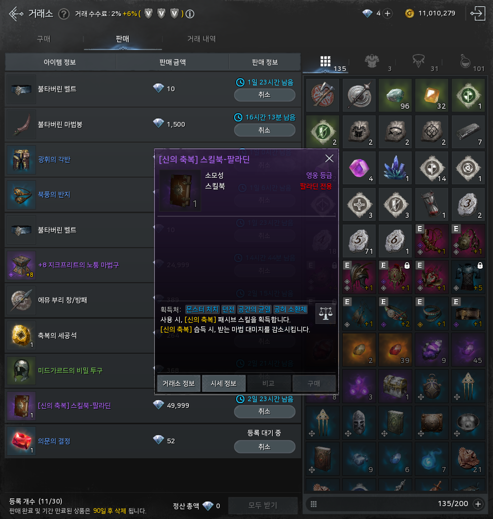 [팝니다] 신의축복(팔라딘영웅스킬북) -받는마법데미지감소/노퉁마법구8강/니다신발/아세라드의귀걸이(수집템)/ 오딘04 서버