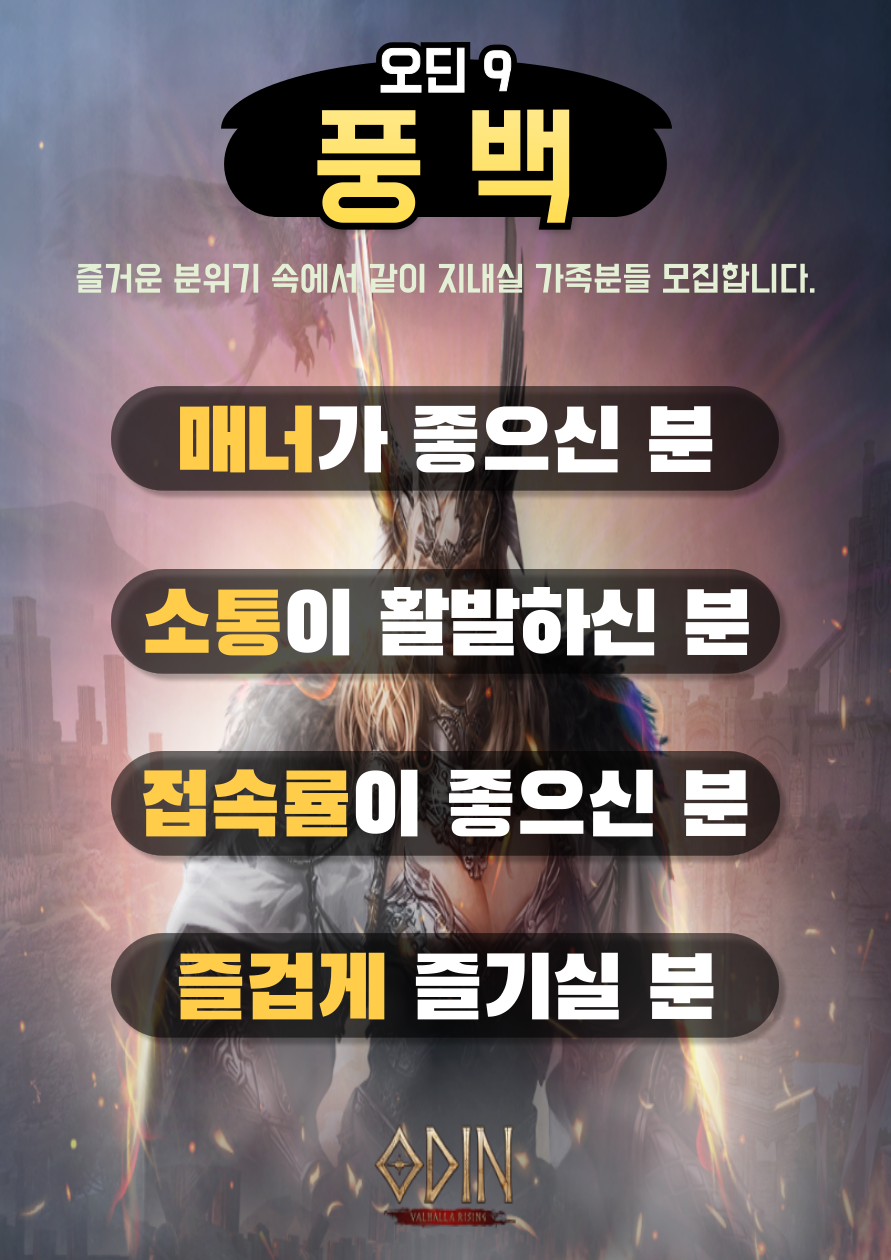 정말 가족 같은 편안한 분위기와 빡겜보단 소통하며 정말 즐겁게 지내는 풍백길드입니다.^^