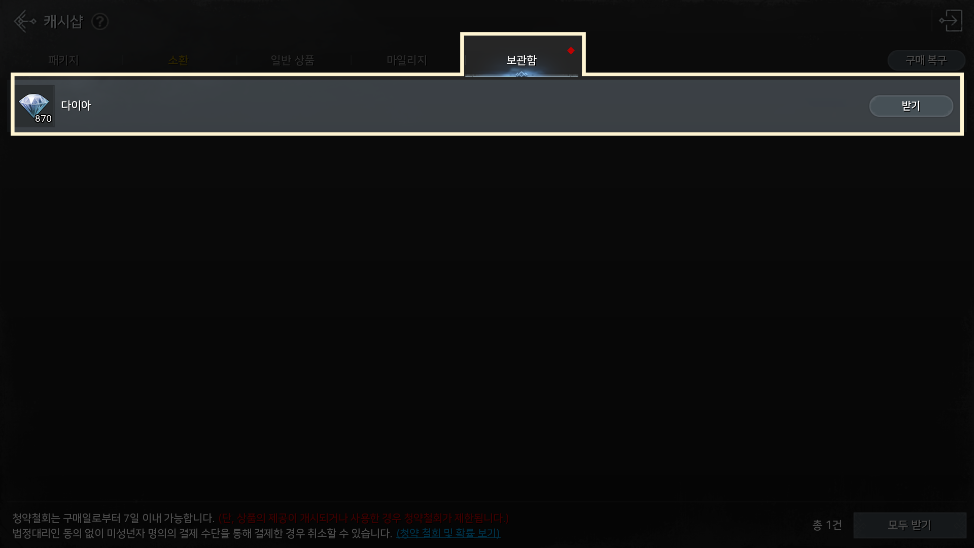보관함에서 구매한 아이템이 확인되지 않는 현상이 발생할 수 있습니다.