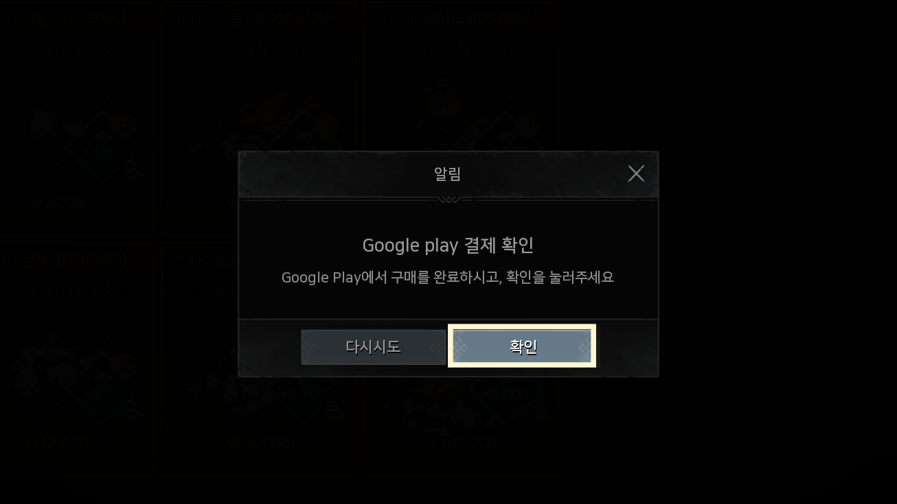 - 3. 게임 클라이언트 내 Google Play 결제 확인 팝업의 [확인] 버튼 선택