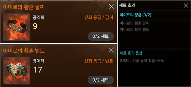 | 토르의 무쇠 투구 | 방어력 30 → 32 | 상태이상 저항 10% → 명중 8 2세트: 방어력 15 → 20 | |