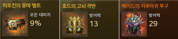 | 토르의 무쇠 갑옷 | 방어력 45 → 47 | 스킬 대미지 5% → 8% 회피 12 → 14 | |