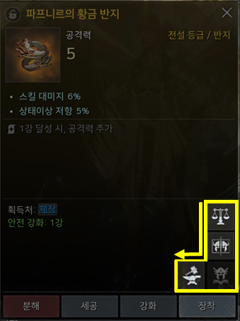 · 화살표 방향 순서 : 거래소 이동, 아이템 비교, 아이템 수집, 제작 가능 아이템 정보 순
