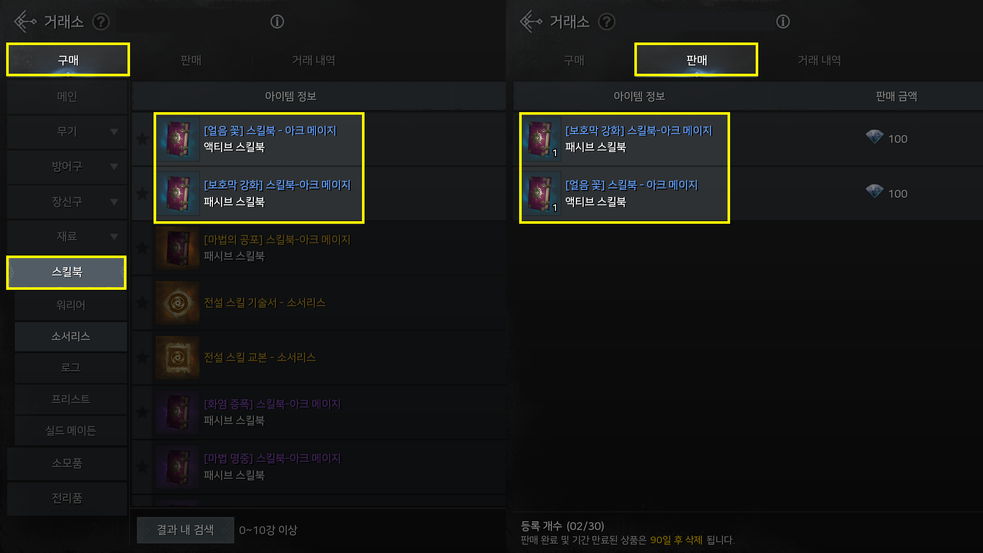 - 거래소 내, 스킬북 아이템의 이름 하단에 '패시브 스킬북'과 '액티브 스킬북'이 구분되어 표기됩니다.