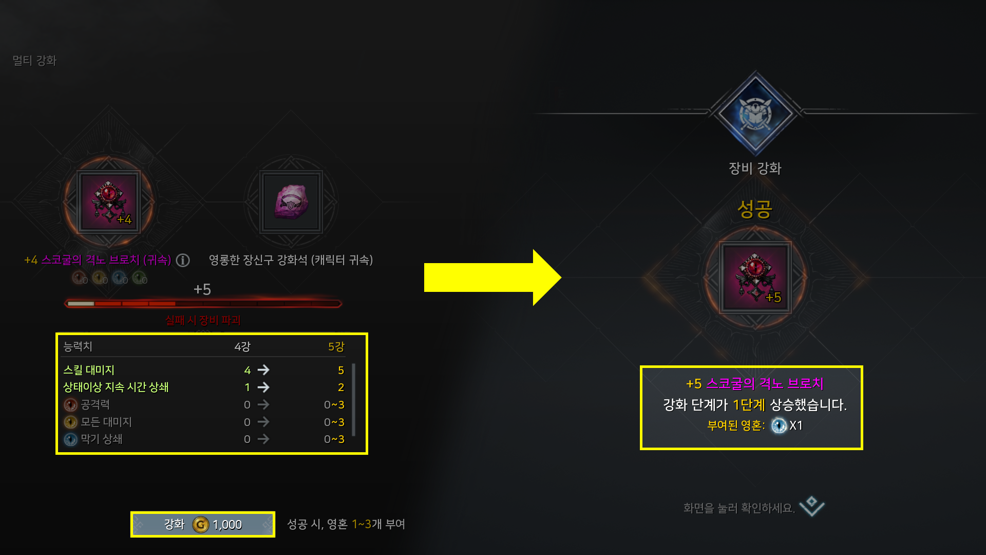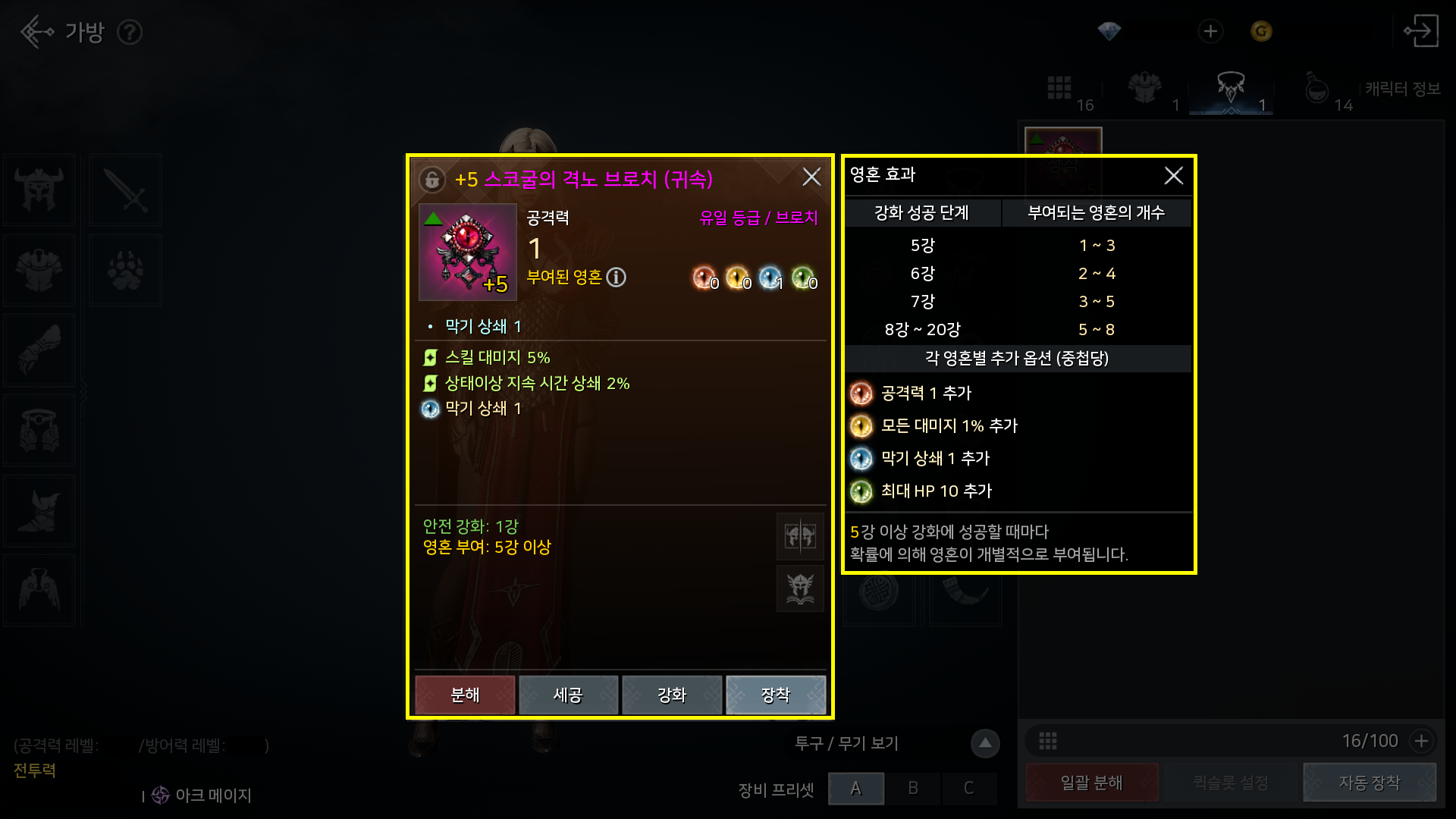 - 유일 등급 브로치는 특정 강화 단계를 달성하면 확률에 따라 영혼이 부여됩니다.