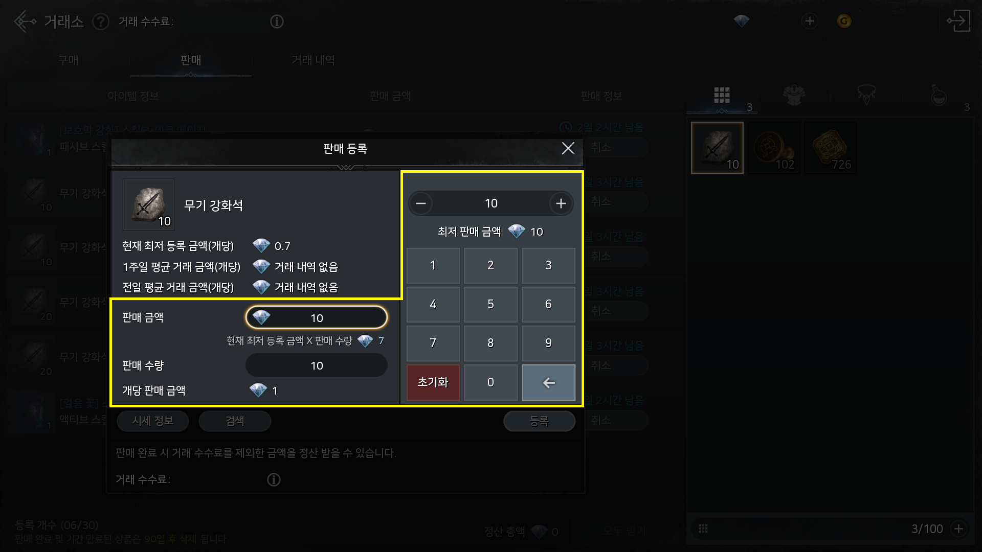 - 거래소 판매 등록 시, [+], [-], [←] 버튼을 통해 초기 입력 금액을 변경한 후 숫자를 추가로 입력하면