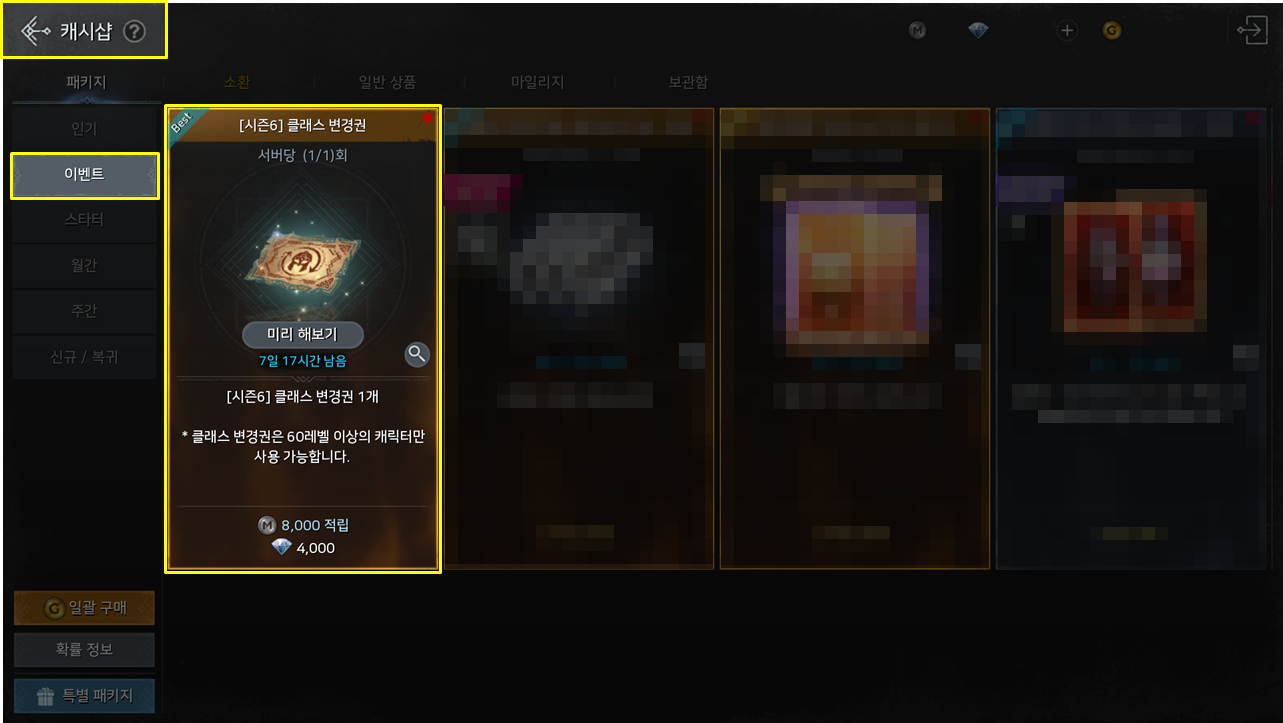 | 클래스 변경 지원 패키지 (시즌 6) | [시즌 6] 클래스 변경의 증표 600개 | 서버당 10회 | |