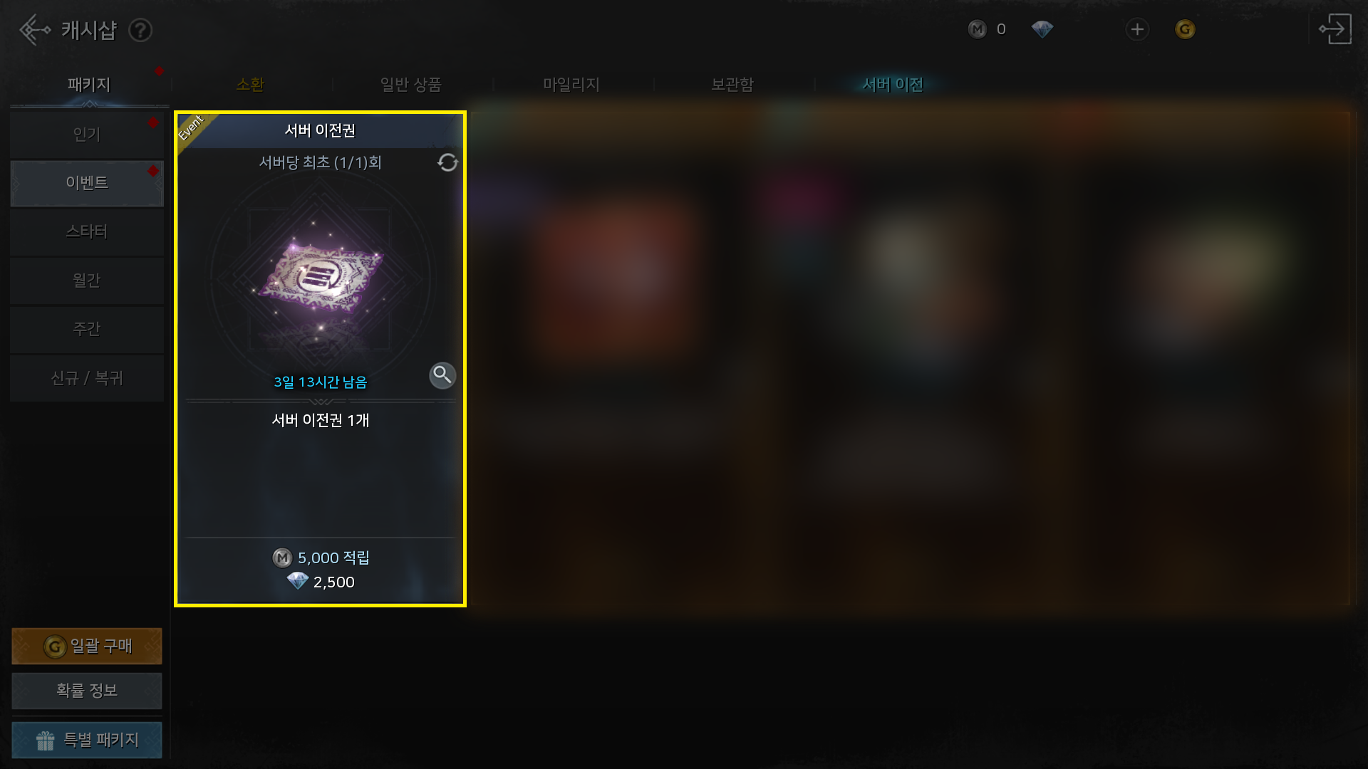 - 동일 계정 내에 있는 모든 캐릭터 정보를 다른 서버로 이전하는 '서버 이전권'을 구매할 수 있습니다.