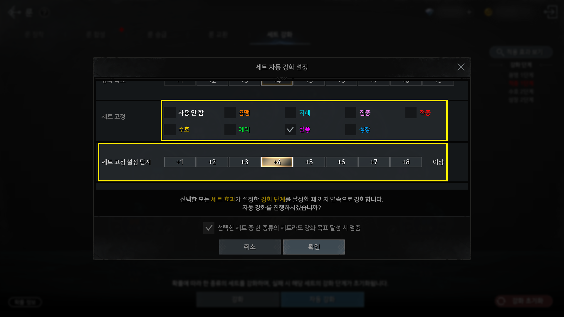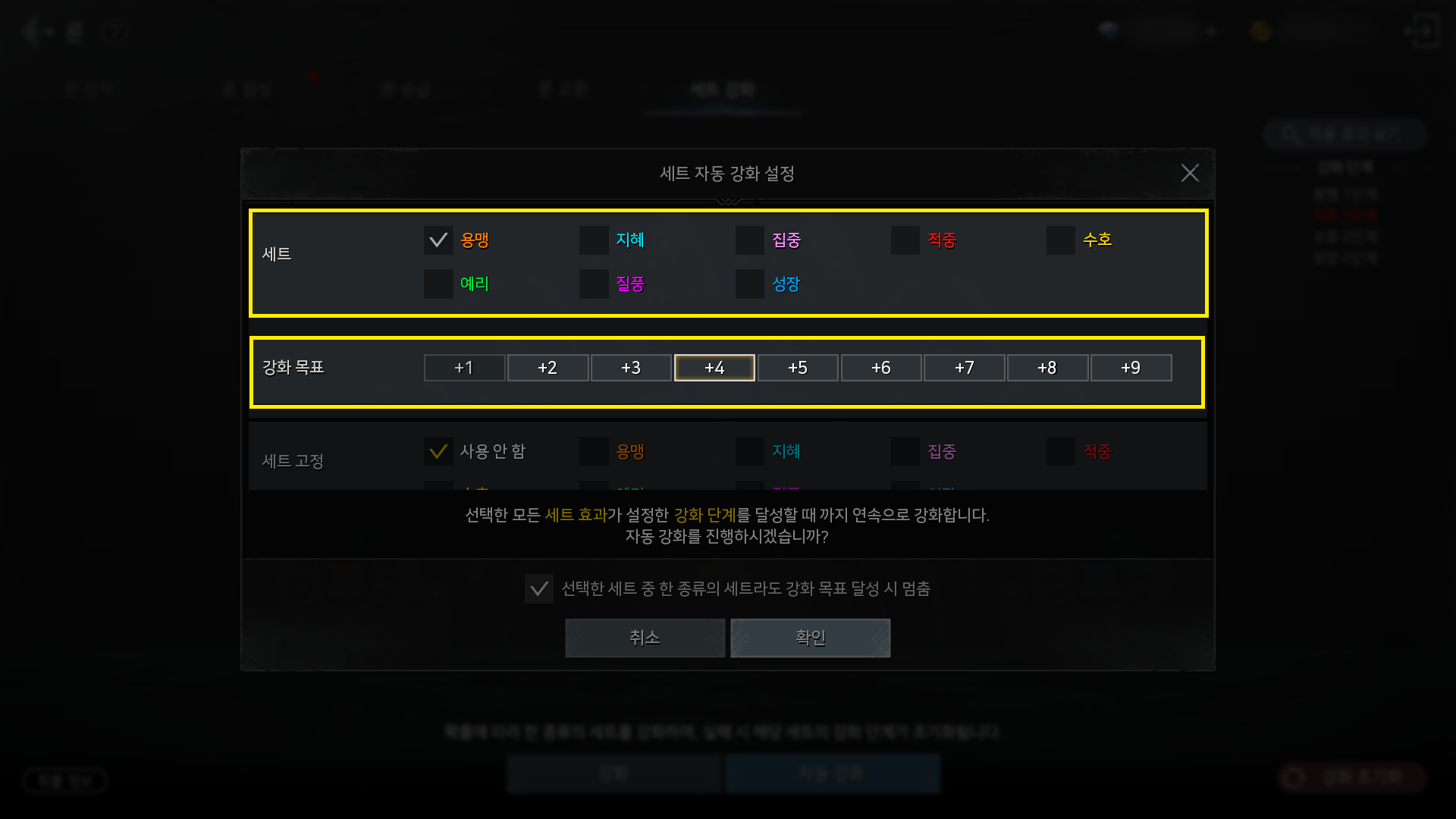 - 강화 목표로 설정된 세트의 현재 단계에 따라 그 이하의 강화 목표 단계는 선택할 수 없도록 변경됩니다.