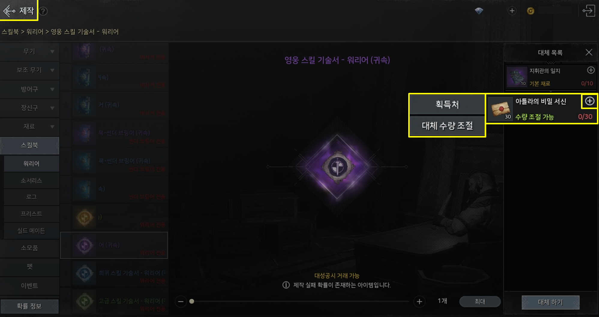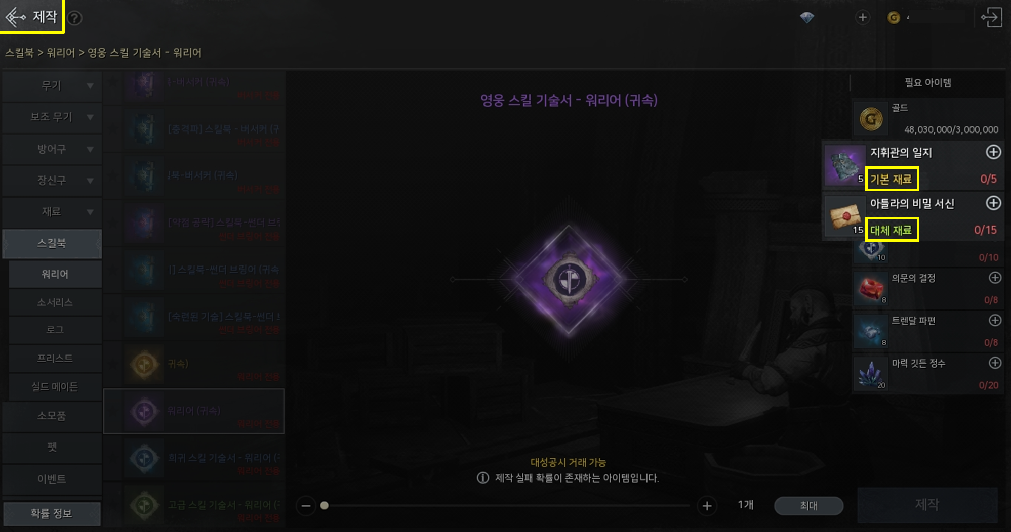 - 대체 재료가 설정되면 필요 아이템 목록에 '기본 재료' 및 '대체 재료' 텍스트로 재료의 속성이 표시됩니다.