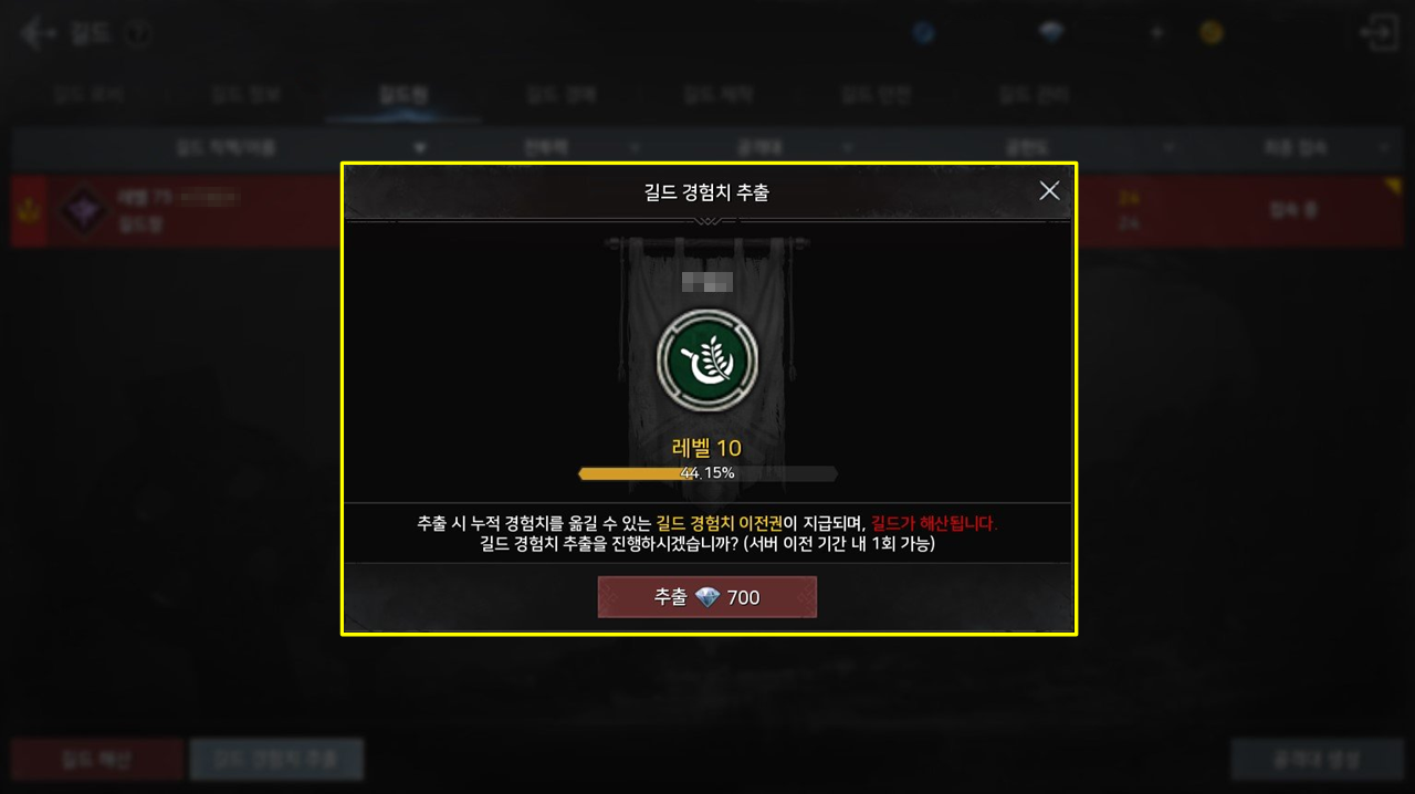 - 길드 경험치 추출 시 다이아가 소모되며, 길드 레벨이 높을수록 비용도 증가합니다.