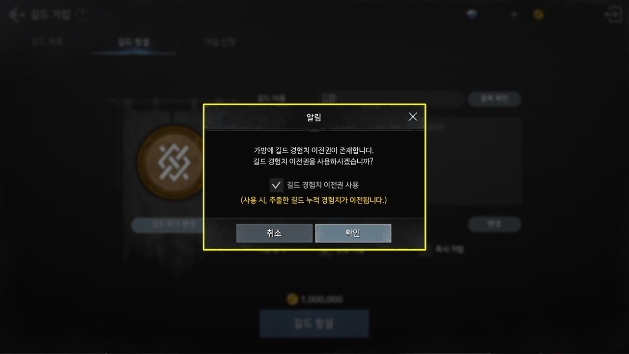 - 가방에 길드 경험치 이전권 아이템이 존재하는 경우, 길드 창설 시 아이템 사용 팝업이 노출됩니다.