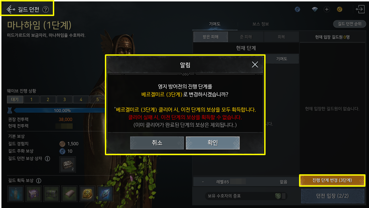 - 변경 가능한 진행 단계를 클리어하지 못한 경우, 영지 방어전 초기화 후 변경 가능한 단계가 1단계씩 감소합니다.