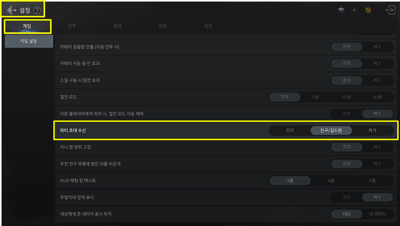 - 해당 설정을 적용하면 친구 / 길드원을 제외한 유저의 파티 초대는 수신되지 않습니다.