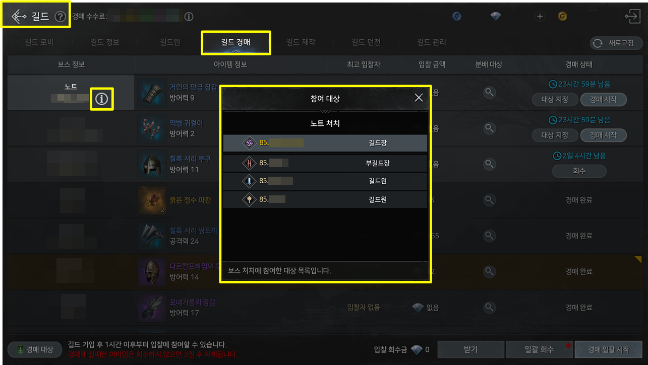 - 길드 경매에 보스 몬스터 처치 전리품이 등록될 경우, 해당 보스 몬스터 처치에 참여한 길드원을 확인할 수 있는