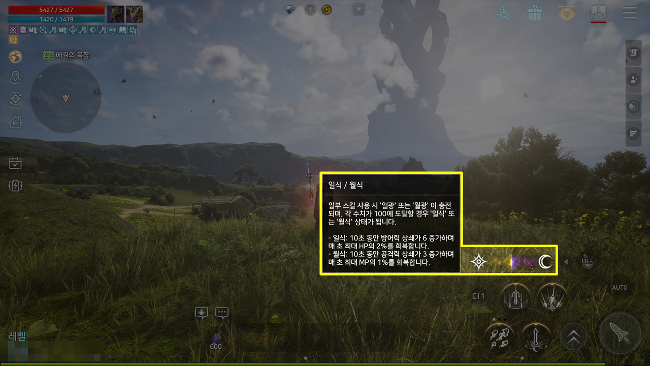 - 빛의 속성 스킬 사용 시 '일광'이 충전되고, 일광이 100%에 되면 '일식' 상태가 되어 일정 시간 동안