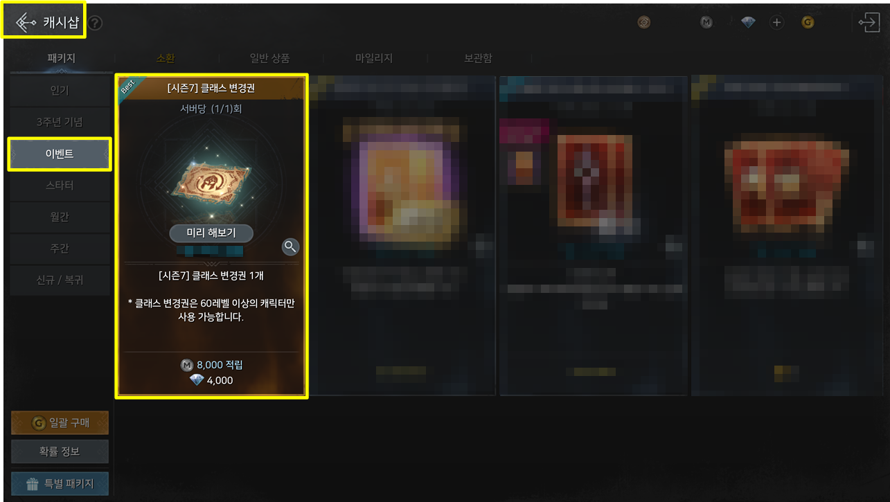 · [주간 상점] 패키지 상품 구매 가능 횟수는 매주 토요일 04:00에 초기화됩니다.
