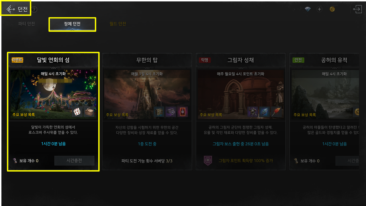 | 월드 정예 던전 | 지하감옥 - 최하층, 월드 던전 | 서버 이름이 동일한 서버군(ex. 오딘 01~09)과 매칭 진행 |