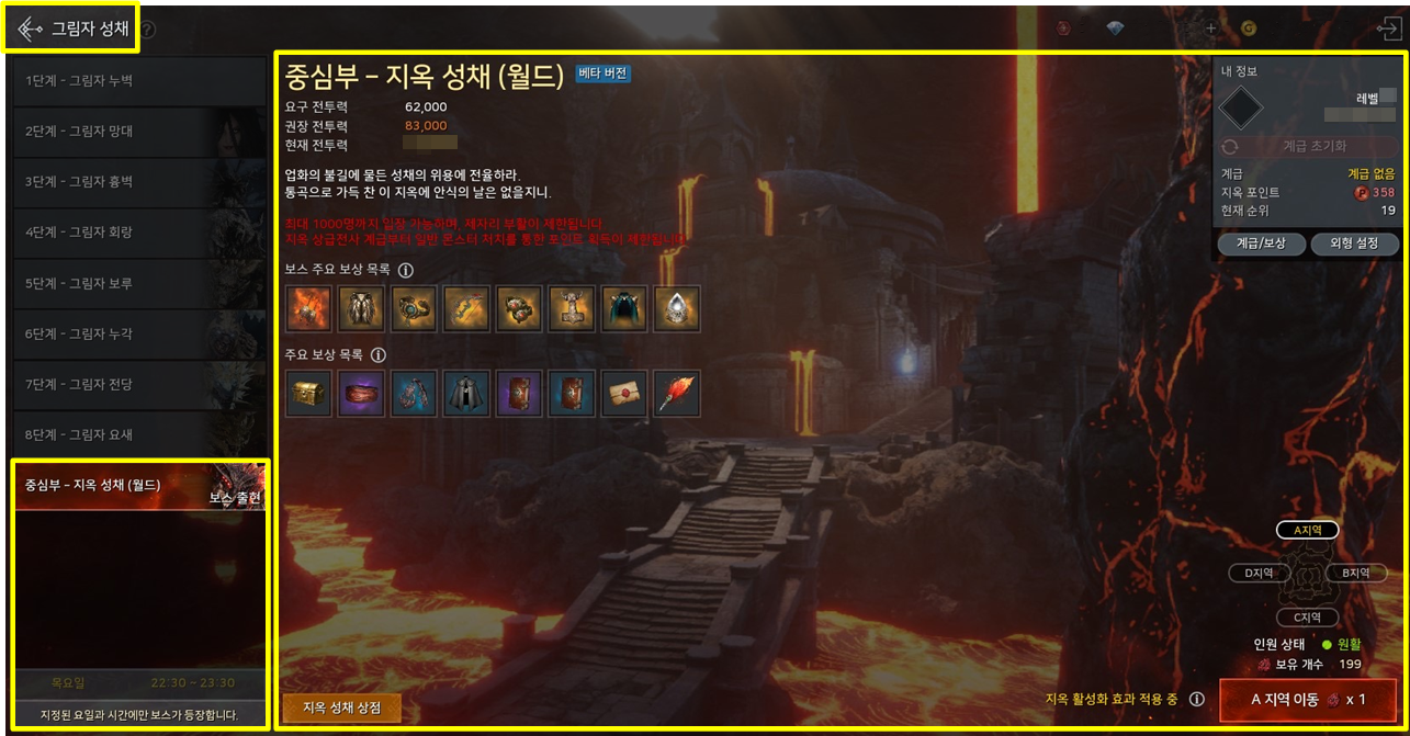 - 던전은 상시 오픈되어 있으며, '그림자 성채 중심부 이동석 - 지옥 성채(월드)'를 사용하여 던전에 입장할 수 있습니다.