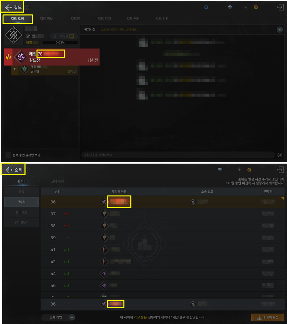 · 순위 화면 내 이펙트 노출 위치: 레벨 탭, 전투력 탭, 길드 레벨 탭(길드장일 경우), 길드 전투력 탭(길드장일 경우)