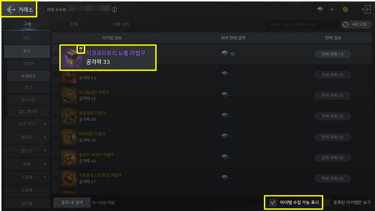- 거래소 구매 탭 내 아이템 수집 가능 아이콘 표시 여부를 설정할 수 있는 기능이 추가됩니다.