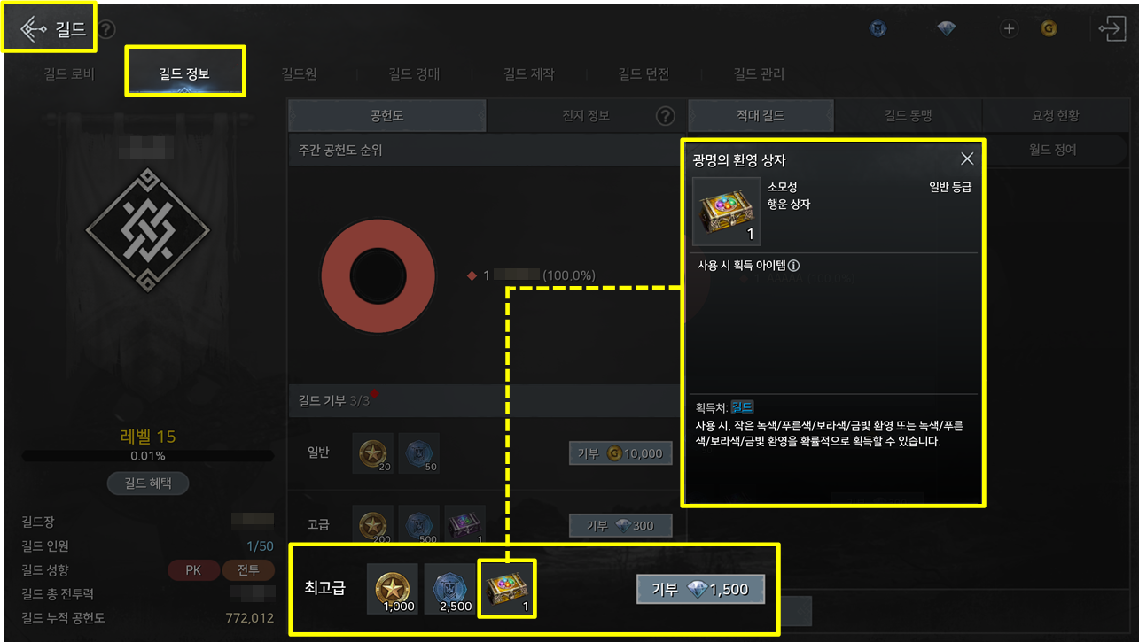 · 최고급 기부 보상: 길드 공헌도 1,000 / 길드 주화 2,500 / 광명의 환영 상자 1개