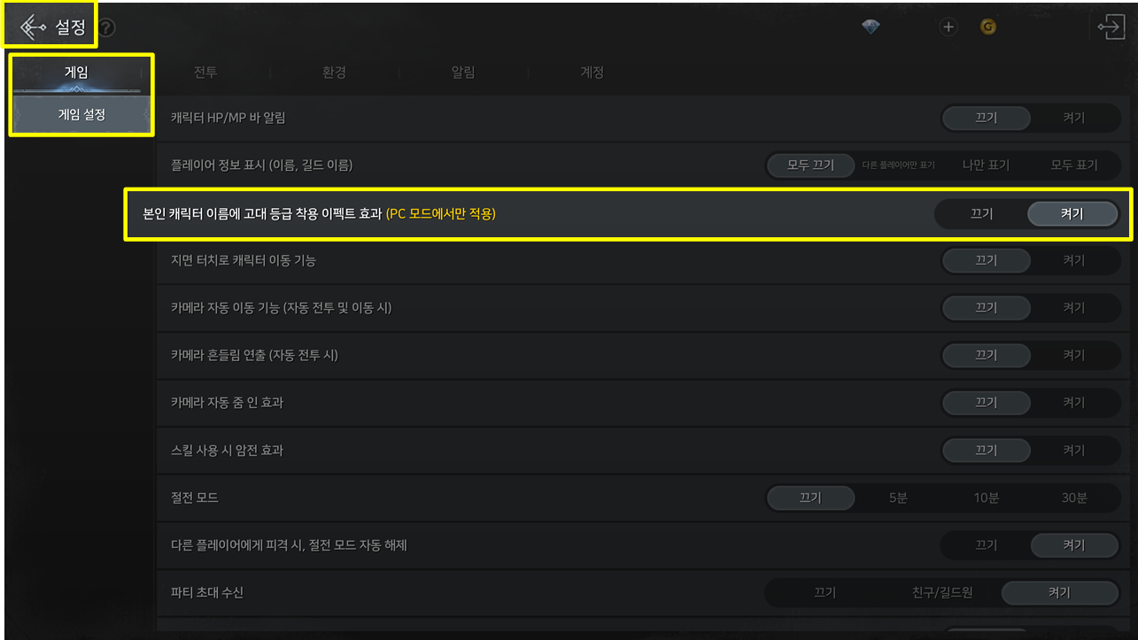 · 켜기 시: 본인 및 타 플레이어에게 이펙트 노출 / 끄기 시: 본인 및 타 플레이어에게 이펙트 미노출