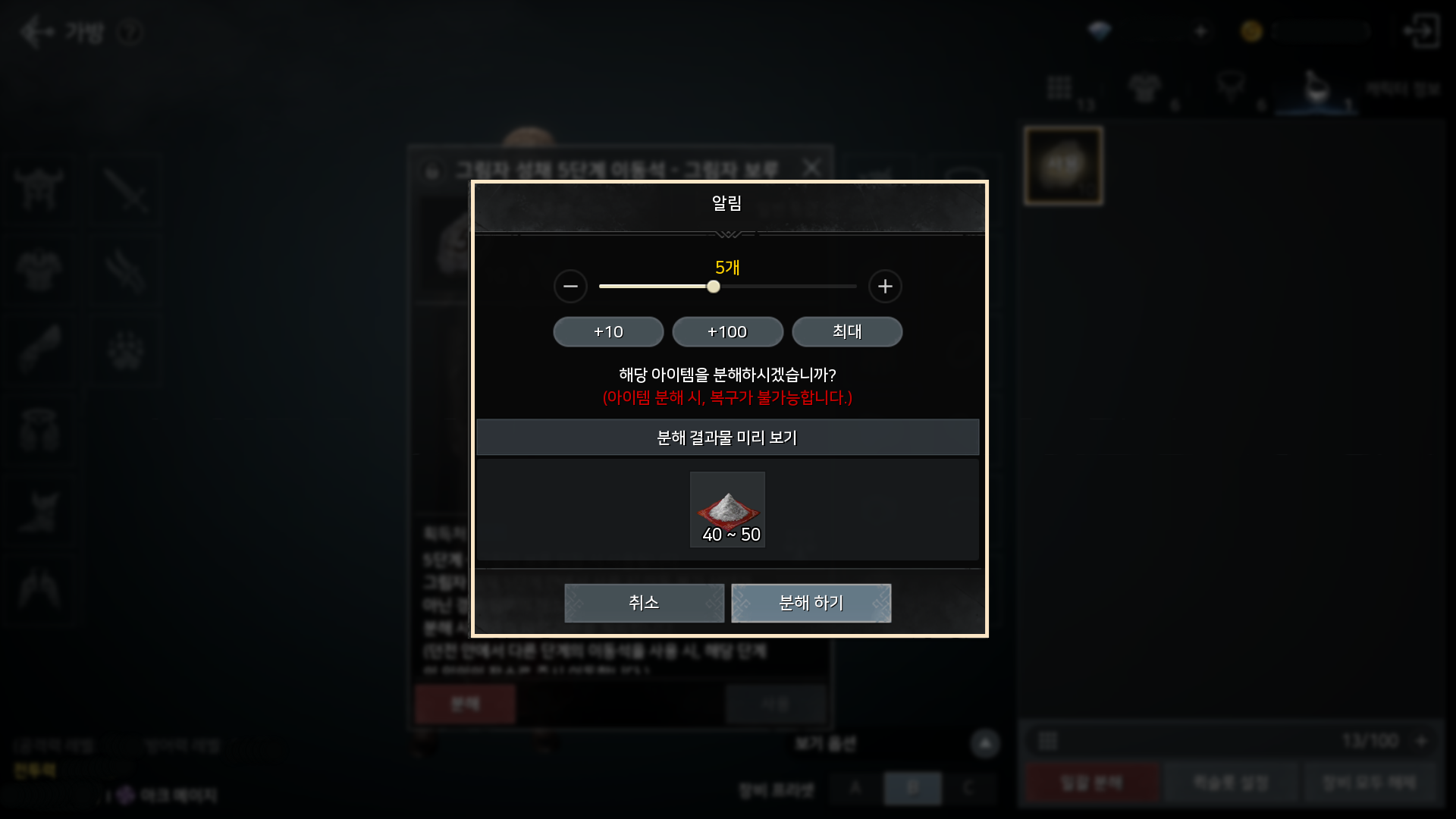 · '수집 가능 아이템도 분해' 항목 체크 시, 수집 가능 아이템도 분해 대상으로 지정됩니다.