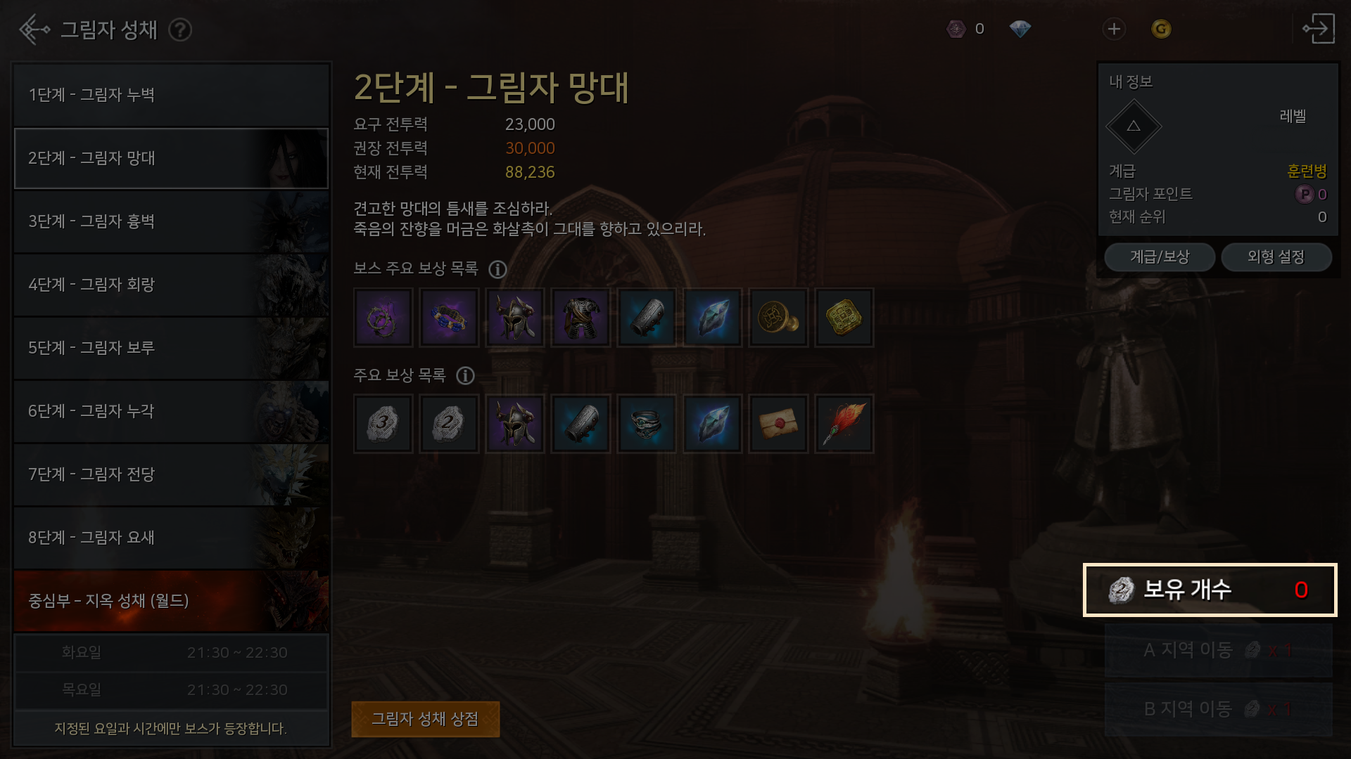 - 그림자 성채 이동석, 그림자 성채 중심부 이동석의 보유량이 0개일 경우 보유 수량의 색상이 붉은색으로 노출되도록 변경됩니다.