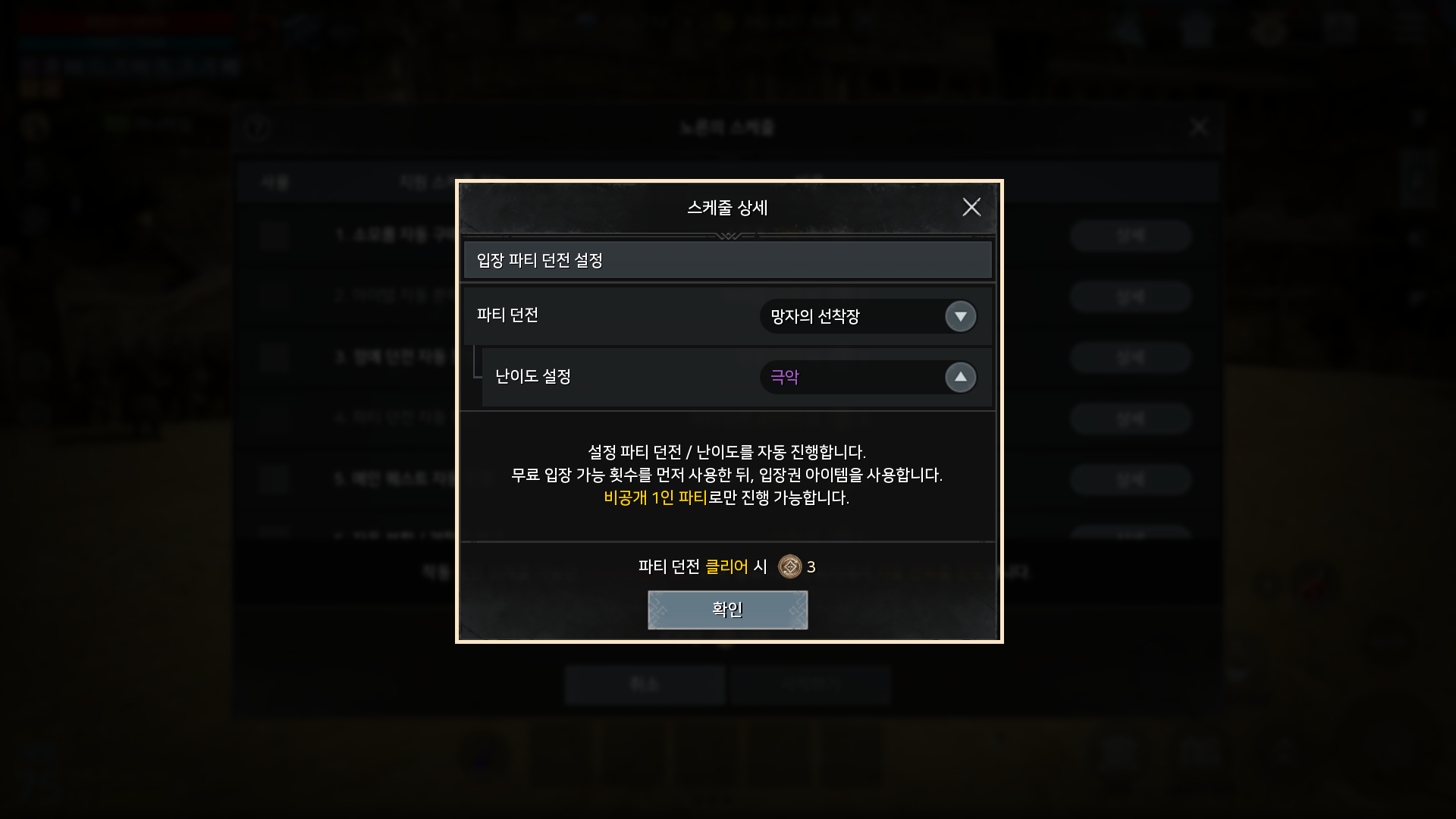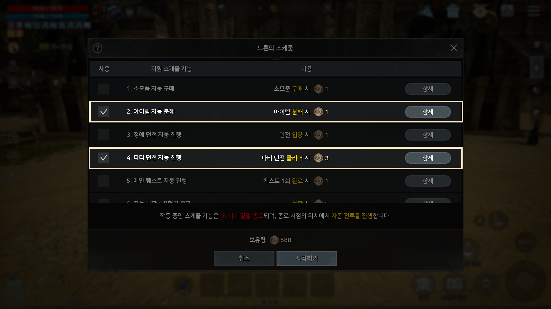 - 노른의 스케줄 팝업 내 상세 버튼을 눌러 파티 던전 입장 던전 및 난이도 설정과 아이템 분해 조건을 설정할 수 있습니다.