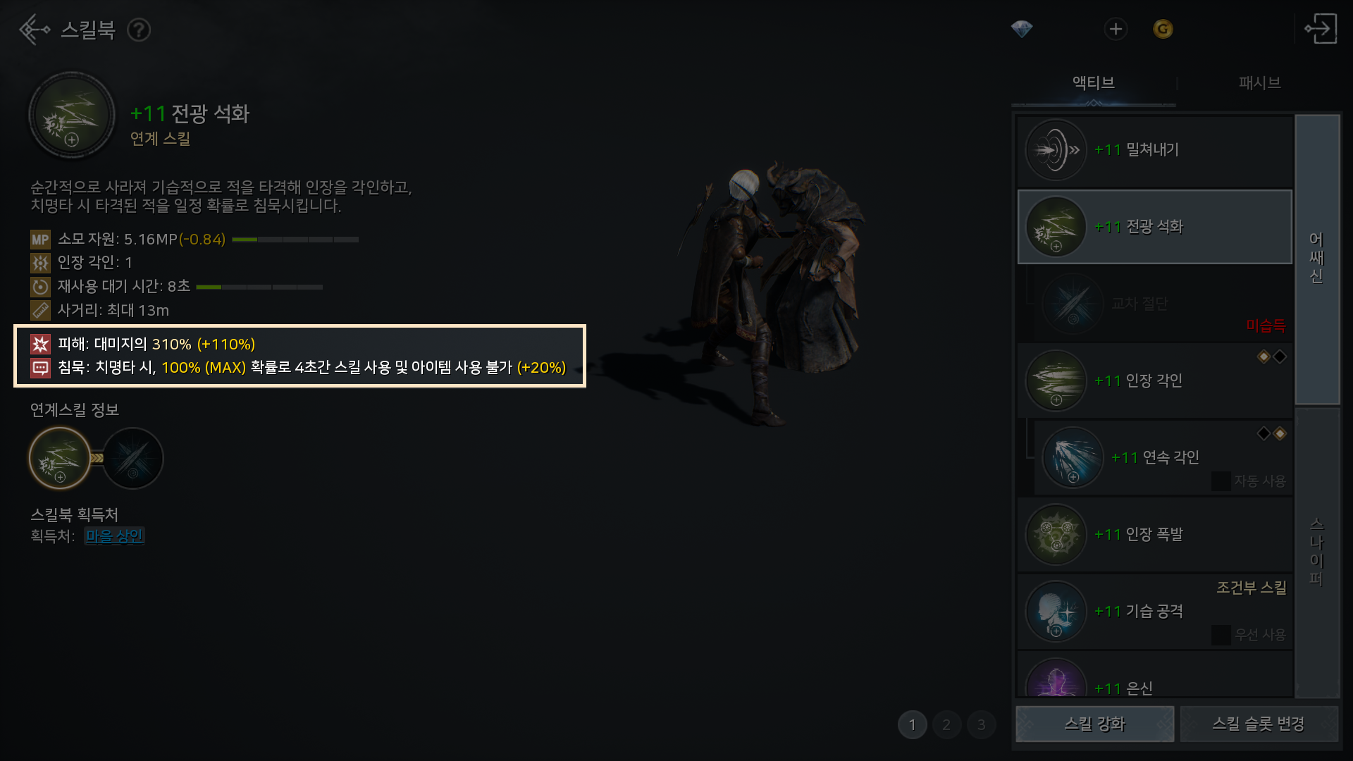 | 광시곡 | [효과 개선] 재사용 대기시간 감소 기본 값 증가 (20% → 30%) [효과 개선] 재사용 대기시간 감소 레벨당 수치 증가 (레벨당 +1% → 레벨당 +2%) [신규 효과 추가] 스킬 사용 시 최대 MP의 10% 회복 효과 추가 | |