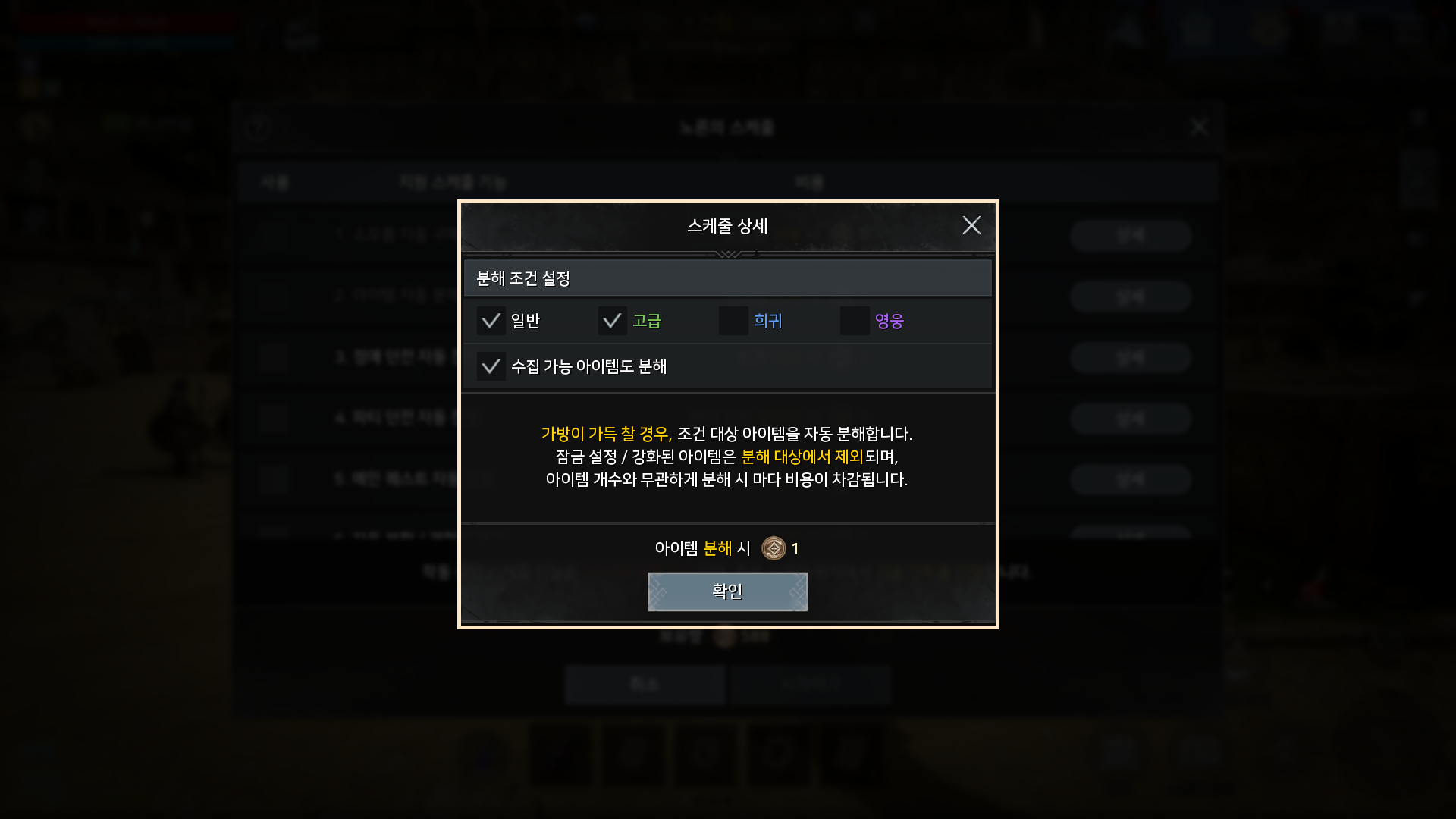 - 가방이 가득 찼을 때, 노른의 스케줄 시작 전 설정한 자동 분해 조건에 해당하는 장비 아이템이 자동으로 분해됩니다.