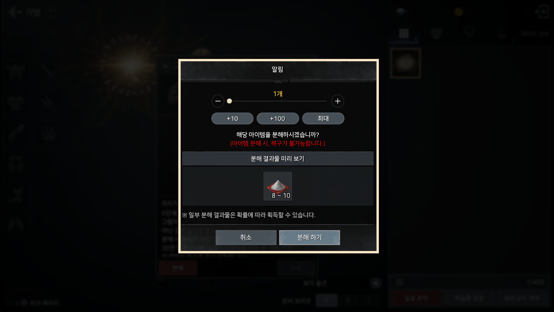 - 아이템 분해 시 결과물 수량을 확률적으로 획득할 경우, "※ 일부 분해 결과물은 확률에 따라 획득할 수 있습니다." 문구가 추가됩니다.
