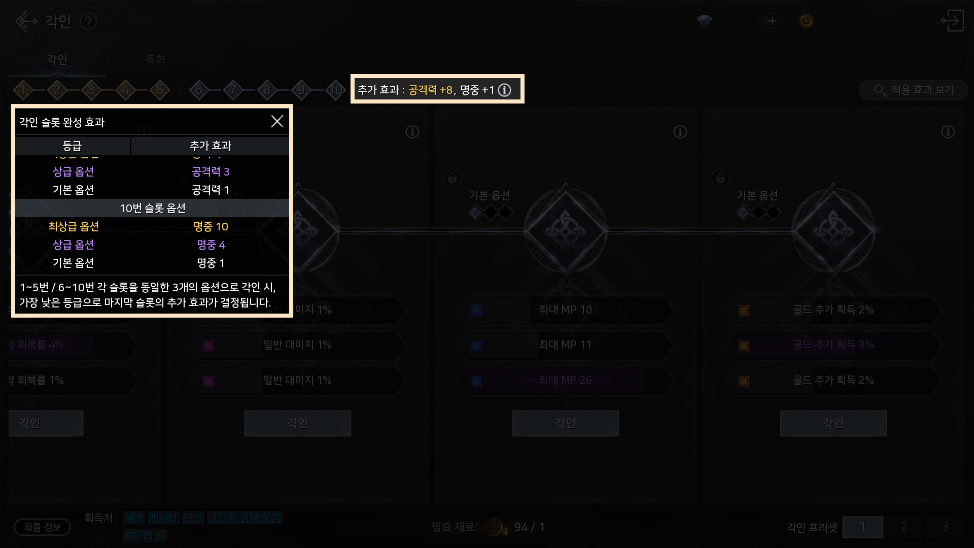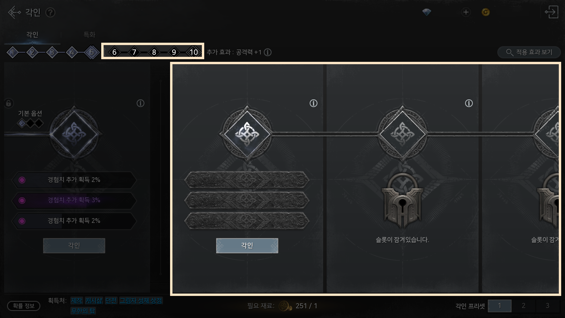 - 6~10단계 각인 슬롯을 모두 완성 시 추가 효과가 부여됩니다.